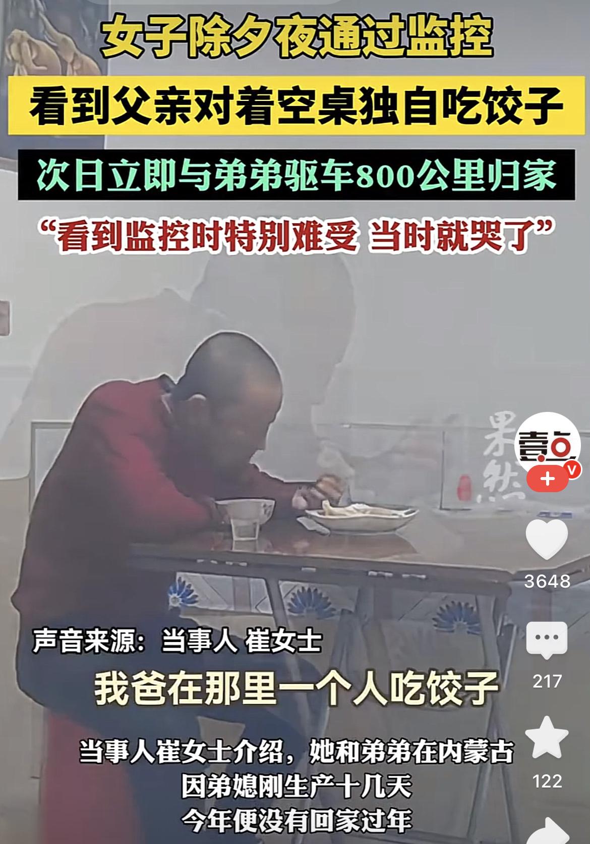 说实话,改下陈规陋习,爸爸就不会独自吃饺子了,你们也不用感动自己了! 这位父亲有三个儿女: 儿子因为媳妇刚刚生完小孩,不能回家过年。 看监控流泪的女儿在外地。 还有一个妹妹同村的,因为是女儿,所以吃了中饭就回去了! 就这个事,需要看到监控才晓得父亲独自吃饺子吗?年前姐弟们不商量商量。 可以有不少方式: 1、就是妹妹一家陪老父亲过年,有啥不可以嘛?那些坚持遵循陈规陋习的人不还是在农村,也没发大财,说明这根本就是无稽之谈! 2、弟弟可以把老父亲接去过年 3、看视频流泪的姐姐,可以早点回家过年,非要看到视频流泪,才赶回去,好好笑! 说起来,还是咱们四川好,从来没有出嫁的女儿不能回娘家过年的,不光出嫁的女儿可以去,连公公婆婆都可以去,大家子轮流在各家过年,热热闹闹吃饭,开开心心打麻将,就这样,四川人也没有穷,反而是人口净流入的省份。