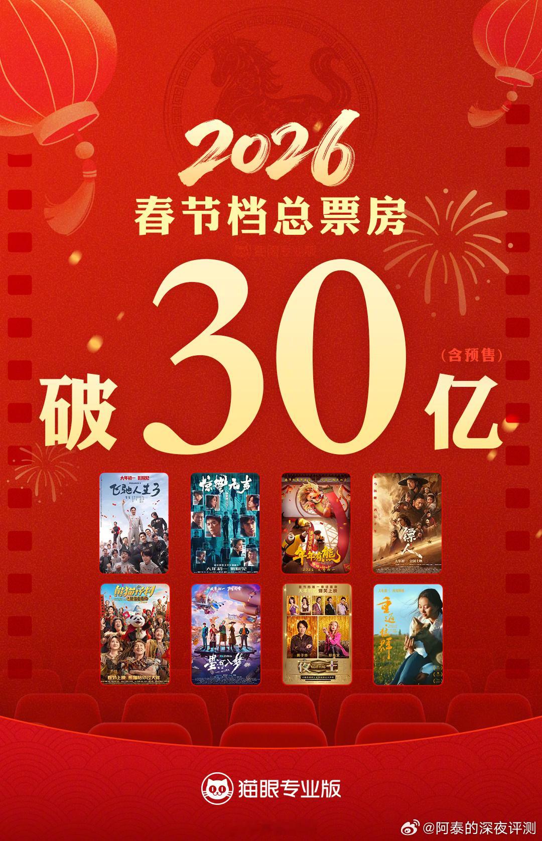 2026春节档票房超30亿据网络平台数据,2026年春节档档期总票房(含预售)破30亿。《飞驰人生3》《惊蛰无声》《熊出没·年年有熊》分列前三位。