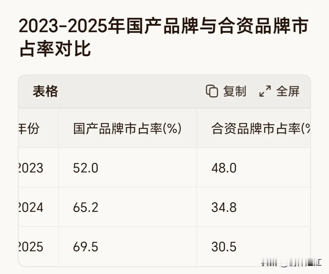 国内汽车市场发生质变,从以前合资品牌汽车三家(德、日、美)分立的形势,到现在国产汽车已经当家作主了,国产品牌汽车总市场份额已经达到70%。这归功于中国新能源汽车产业的良好发展形势。我们发现,年轻人第一辆车的第一选择往往是新能源汽车,而身边的老朋友换车时第一选择往往也是国产品牌新能源汽车。原来还对新能源汽车有顾虑的朋友,他们说叫滴滴打车的时候跟司机交谈,了解到新能源汽车确实好用和省钱,才下定决心换新能源汽车。也有朋友说,如果固态电池成熟后,他们也毫不犹豫的选择购买国产新能源汽车。只要好用和省钱,再有安全保障的条件,国产新能源汽车的前景就是星辰大海了。德日美品牌的燃油车就越来越边缘化了,这个趋势肯定是不可逆转的。