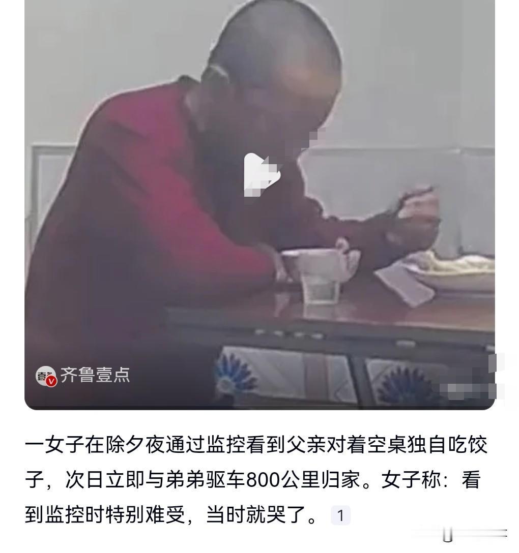 人生有各种各样的无奈,人生百态。 爸爸除夕独自吃饺子,女儿看监控哭了。 第2天就和弟弟开车800公里回家。 看着爸爸一个人在除夕夜吃饺子,确实太冷清了,也不团圆,心里确实不得劲儿啊。 所以也能明白儿女的心情,就想回去陪陪老爸。 很多人一年到头就盼着这一天回家和家人团聚。