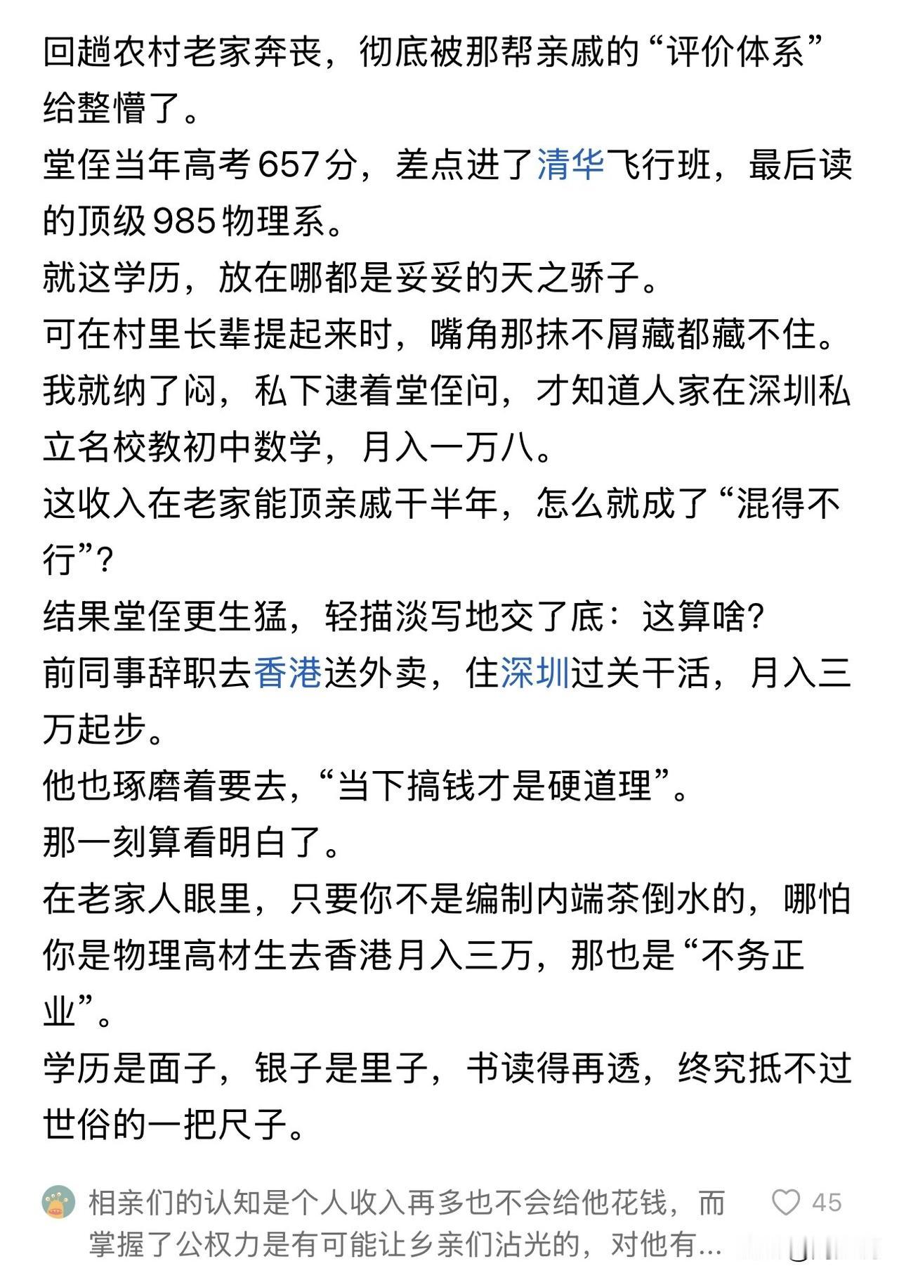 “回村奔丧被亲戚整破防!”一位网友说,回老家奔丧,彻底被亲戚整懵了。堂侄当年高考657分,差一点就踏进清华飞行班,最后读了顶尖985高校的物理系,妥妥的学霸人设。本以为这样的学历,在老家能被夸上天,可村里长辈提起他,嘴角的不屑根本藏不住。 网友越想越纳闷,私下问了才知道,堂侄现在在深圳私立名校教初中数学,月薪一万八。这收入在老家,抵得上普通亲戚忙活大半年,怎么就和“混得不行”挂上钩了? 堂侄反倒看得开,还跟网友说,前同事辞职去香港送外卖,往返深港上班,月入三万多,他自己也动了心思,觉得当下能赚到钱才是实在的。 此事曝光后,网友看法不一。有网友感慨:“老家的评价标准太单一了,除了编制,啥好工作都不入眼”。 也有人说:“高学历不代表一定要走科研路,选择自己喜欢的路赚钱,没什么错”。 看完这事,周少也被这种思想所惊艳到了。很多时候,世俗总爱用一套固定的标准去定义成功,好像只有考上编制、端上铁饭碗,才算人生圆满。 可学历的意义,从来不是被单一标准绑架,高材生选择教书、送外卖,只要是靠自己的能力生活,都不该被贴上“不务正业”的标签。 我们总被身边的声音影响,慢慢忘了,成功本就没有统一答案。不必逼着所有人都活成世俗眼里的“标准答案”,尊重不同的选择,接纳多元的人生,才是我们该有的认知。#寻美三湘# #周少说教育#