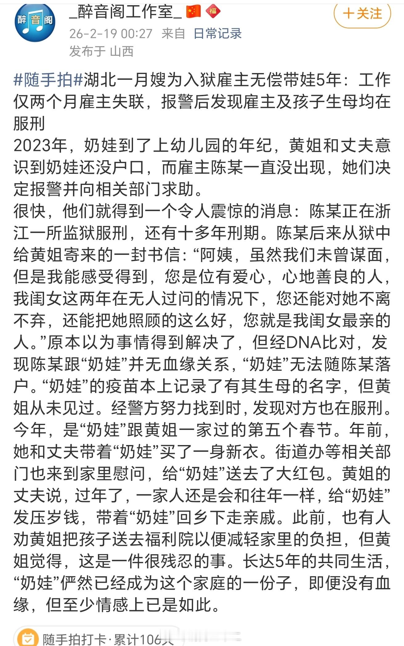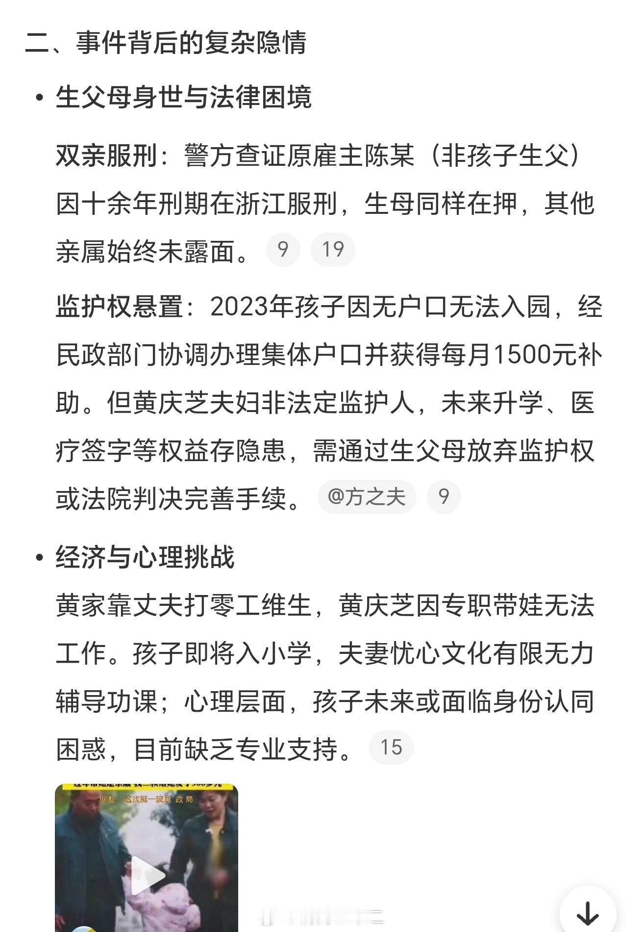 月嫂回应为入狱雇主无偿带娃这个孩子真是“天崩开局”,但是也确实命好,遇到了一对好人夫妻,得以能够在很好的家庭中成长。1、这个事件里面真正的问题不是法律问题,在中华法系下,法律的问题其实真不大,真正的问题是背后的社会学问题,我个人是希望,她能在已经事实上成为她的养父母的这对夫妻身边长大成人的。2、基于“先唱白脸再唱红脸”的原则,应该先掰扯清楚这个事情,孩子的生理父母的身份界定,已知孩子的生母B在服刑,不是生理父亲但是委托抚养人的A1也在服刑,生理父亲A2是谁,A1是不是法理父亲或情理父亲,这种混乱关系,重新加在孩子身上与成长过程中,对孩子是很不公的,她本来得到了新的好的“原生家庭”,把已经成为“废弃”的生理家庭再按给她,对她的成长是不合适的,所以让生理父母放弃抚养权,将抚养权转移给养父母与民政,对小孩的成长会更合适一点。道理要讲清楚,社会共识也应该慢慢养出来。(这里面有句话我没有讲)3、法理风险,其实可以不存在的,这个小孩能流落到“保姆”手上五年,已经说明了无论是主动还是被迫,她也必须遇到了连串的弃养才能被动的沦落到这一步,如果不是遇到了好人父母,她的婴儿期会有多大的麻烦?要实事求是。