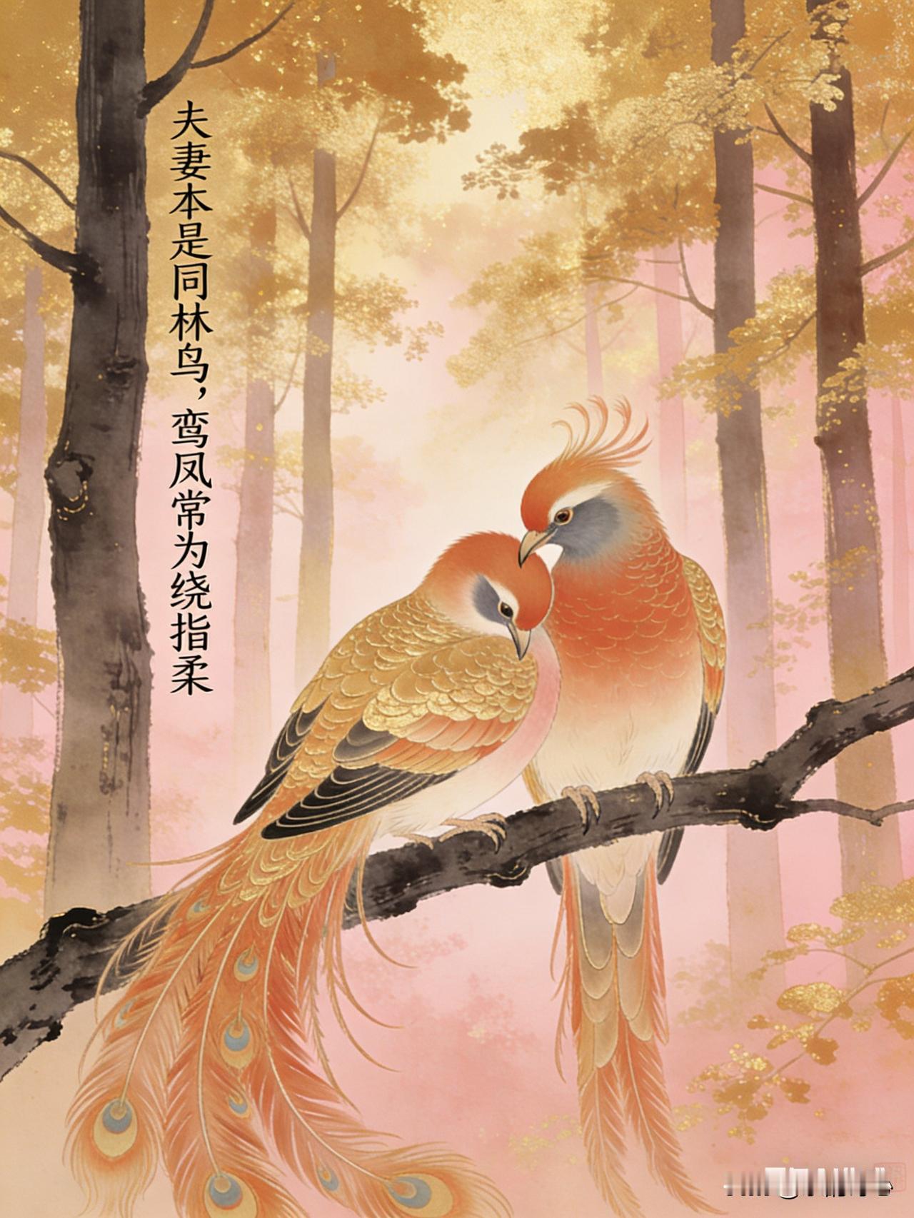 上联:夫妻本是同林鸟, 下联:鸾凤常为绕指柔。 “鸾凤”是传说中象征吉祥、美满的鸟类,常用于夫妻恩爱。“绕指柔”原形容剑的柔韧,这里借指夫妻之间那种细腻、温柔且相互缠绕的深情。寓意夫妻如同鸾凤般恩爱,彼此的情感如绕指之柔,相互依偎、难舍难分,体现出夫妻间深厚的眷恋之情。