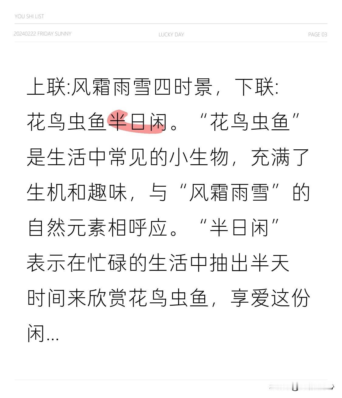上联:风霜雨雪四时景, 下联:花鸟虫鱼半日闲。 “花鸟虫鱼”是生活中常见的小生物,充满了生机和趣味,与“风霜雨雪”的自然元素相呼应。“半日闲”表示在忙碌的生活中抽出半天时间来欣赏花鸟虫鱼,享爱这份闲适和自在,体现出一种恬淡的生活态度。