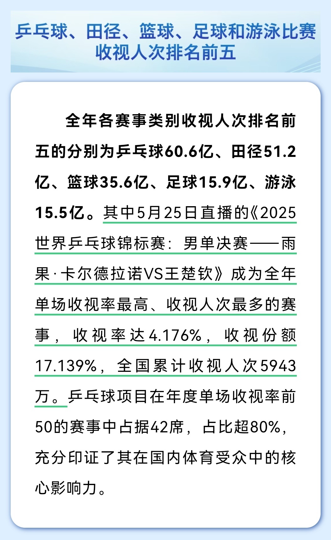 王楚钦 2025年度体育赛事收视率总结📝楚钦出战的世乒赛男单决赛收视率超级牛逼,超级火🔥🔥🔥广电CVB:5月25日直播的《2025世界乒乓球锦标赛:男单决赛——雨果·卡尔德拉诺VS王楚钦》成为全年单场收视率最高、收视人次最多的赛事,收视率达4.176%,收视份额17.139%,全国累计收视人次5943万。【全年单场收视率最高、收视人次最多】央视CSM:体育频道直播"男单决赛(王楚钦vs雨果)"精彩绝伦,汇聚全国约3295万不重复观众,平均收视2.66%,刷新近十年世乒赛单场收视纪录巅峰收视3.67%,位居上星频道同时段收视第一!体育频道直播男单决赛,人均收视时长30分钟,占整场比赛播出时长的58%,观众忠诚度极高!【刷新近十年世乒赛单场收视记录位居上星频道同时段收视第一】王楚钦牛逼世乒赛男单全程外战夺冠超牛逼👏👏国乒首位左手世乒赛男单冠军☝🏻世乒赛金满贯、世乒赛六金王👑创造历史的王楚钦超牛逼👑🔥