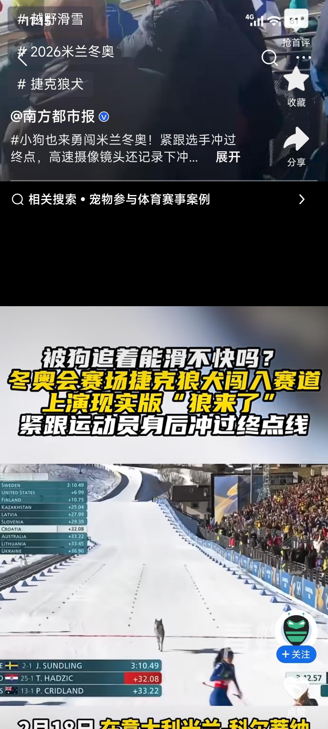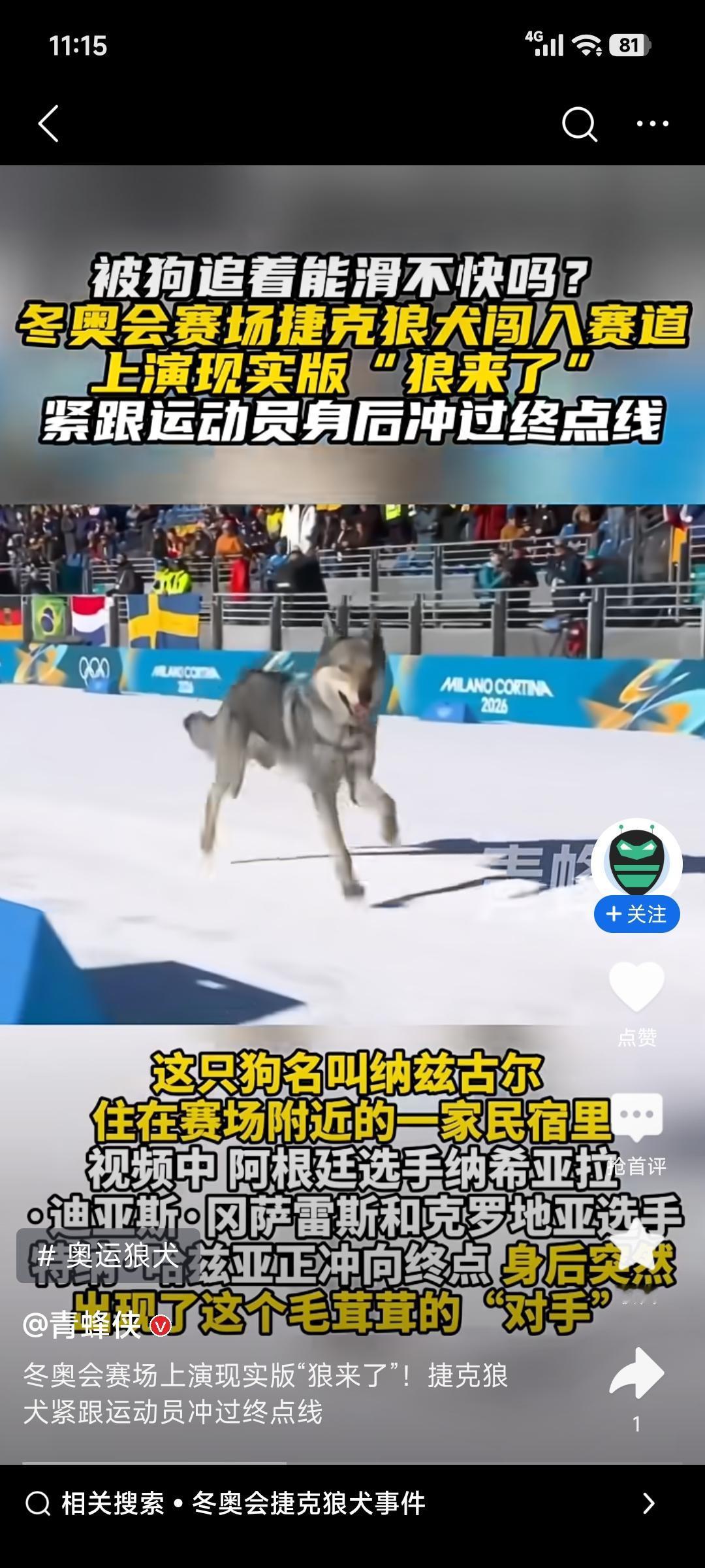 2月18日米兰 - 科尔蒂纳冬奥会越野滑雪女子团体短距离自由式资格赛,出现超有趣的一幕。一只两岁的捷克斯洛伐克狼犬纳兹古尔突然闯入赛道,跟着选手一起冲过终点线。 这狗名字源于《魔戒》里的戒灵,住在赛场附近民宿。当天主人出门,它不甘心被留,就溜到了奥运赛道。比赛时,阿根廷和克罗地亚选手冲向终点,毛茸茸的纳兹古尔紧跟其后,差点超到前面,还在终点线附近凑上去闻阿根廷选手。它主人说它倔强又爱社交、不伤人。这狼犬成了赛场最大惊喜嘉宾,也给冬奥会添了别样趣味。