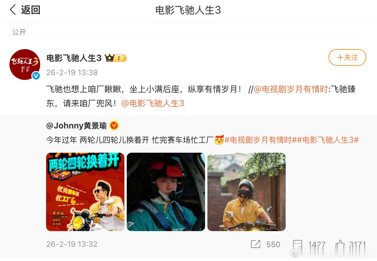 黄景瑜打工赛车两不误 别人春节假期悠闲度假,黄景瑜却在四轮和两轮之间无缝切换。一边在《飞驰人生3》里感受风的速度,一边在《岁月有情时》里体会情的温度,这工作强度,太拼了!