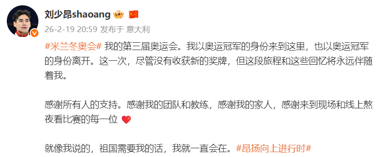 发博:我的第三届奥运会。我以奥运冠军的身份来到这里,也以奥运冠军的身份离开。这一次,尽管没有收获新的奖牌,但这段旅程和这些回忆将永远伴随着我。