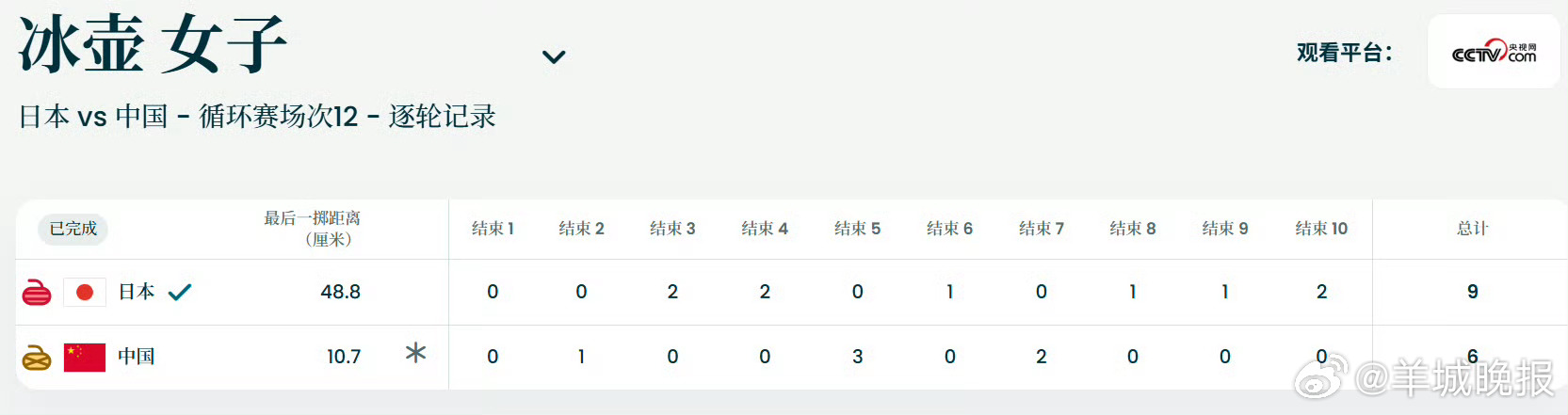 【#中国冰壶女队6比9日本队##中国冰壶队米兰冬奥收官#】米兰冬奥会冰壶循环赛最后一个比赛日,中国冰壶女队最终6比9不敌日本队,循环赛2胜7负,无缘半决赛。