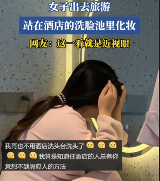 素质这个东西不是什么人都有的。 浙江,一女子出去旅游,坐在酒店的洗脸池里化妆。一下子,洗脸池成了泡脚池。 看着女子的架势,恨不得扎镜子里,知道她近视。但是近视,也不是让洗脸池变成泡脚池的理由。知道自己近视,完全可以带个小镜子出来,坐在小桌子上化。 更何况,这种洗脸池下面就两个三角架,承重能力有限,很容易坐塌了洗脸池。或者下来不小心,摔一跤,又是另外一个故事了。 这种人太没素质了,还发出来,觉得自己很聪明吗?