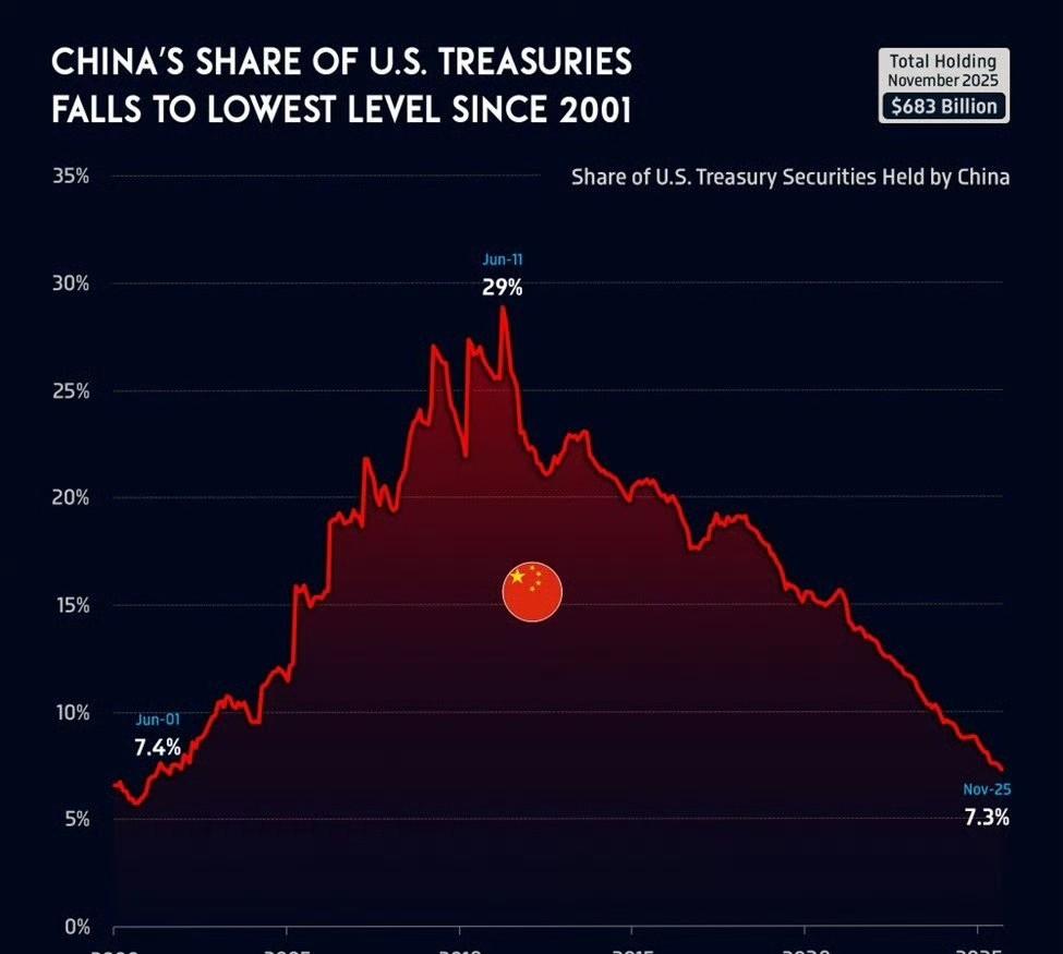 中国手里的美债,占外国持有总量的比例,掉到了7.3%。这是2001年以来的最低点。 跟2011年6月那会儿比,惨不忍睹。那时候占比是28.8%,现在直接蒸发21.5个百分点。 翻译一下:过去二十年攒下的家当,硬生生吐出去了一半还多。 7.3%是什么概念?以前每100块美国国债里,有近29块贴着中国的标签。现在呢?只剩7块3毛。 钱去哪了? 没跑远,转身进了金库。央行1月份又买了1吨黄金。别小看这1吨,这是连续第15个月往库里搬金砖。现在手里攥着2308吨,堆出了历史新高。 这事透着股狠劲儿。 就像以前村里最老实的大哥,年年捧场买你家理财产品。突然有一天,不光不买了,到期还把钱取出来,扭头去镇上金店买了最沉的金条抱回家。 这不叫调整仓位,这叫给钱匣子换锁芯。 有意思的是,这边中国在悄默声地换锁,那边还冒出个更扎眼的信号——丹麦,那可是跟着美国混了几十年的老兄弟,也开始动手减持美债了。就卖了1个亿,数目不大,但像根刺。这1个亿捅破了那层窗户纸:美债“绝对安全”的神话,连自己人都不信了。 美国财政部的账本上,中国那一栏的数字还在跳水。 特朗普在达沃斯放过狠话:谁敢抛美债,美国有的是手段。话是硬的,但账本不讲情面,数字只管往下出溜。 6830亿美元,这是中国手里剩下的牌。 但牌桌对面的人已经看出来了,这位老对手不准备接着出牌了。他在研究换一副牌玩。 黄金这玩意儿,没利息,没电子记账那么方便,还有个毛病是得扛得搬。但它有一个致命的优点——它不认识“制裁”这俩字怎么写。 俄乌那场冲突之后,几千亿美元的外汇储备,人家说冻就给冻了。这堂课,谁都看懂了,谁都得记心里。 所以这哪是什么简单的资产挪移。 这是在给自己搭避风港。外面风大浪急,手里攥的是能摸得着的硬家伙。管你什么主权信用,什么国际结算,到了那一步,只有黄金不吭声,但也只有它不叛变。 现在的问题是:如果连最大的债主都对这张借条冷了心,那接下来谁来接盘?美国每个月海量发的新债,卖给谁? 这个悬念,比6830亿那个数字本身,更让华盛顿睡不着觉。 毕竟,一个靠借新还旧运转了几十年的体系,最怕的不是债主来敲门,而是债主站在门口说:这游戏你自个儿玩吧,我不伺候了。