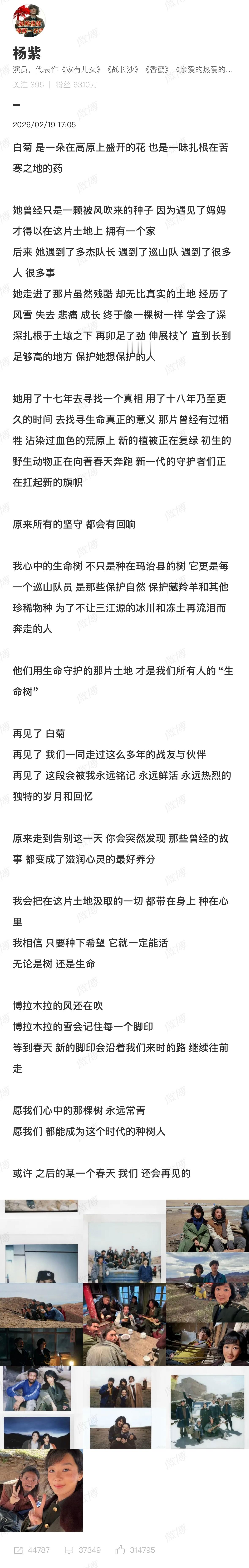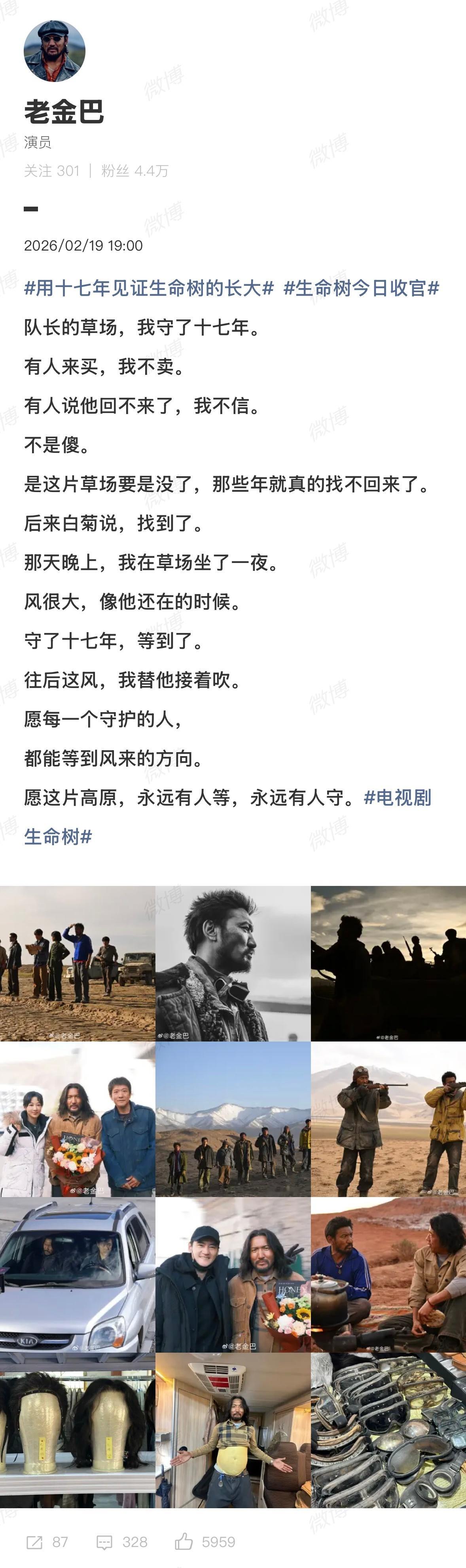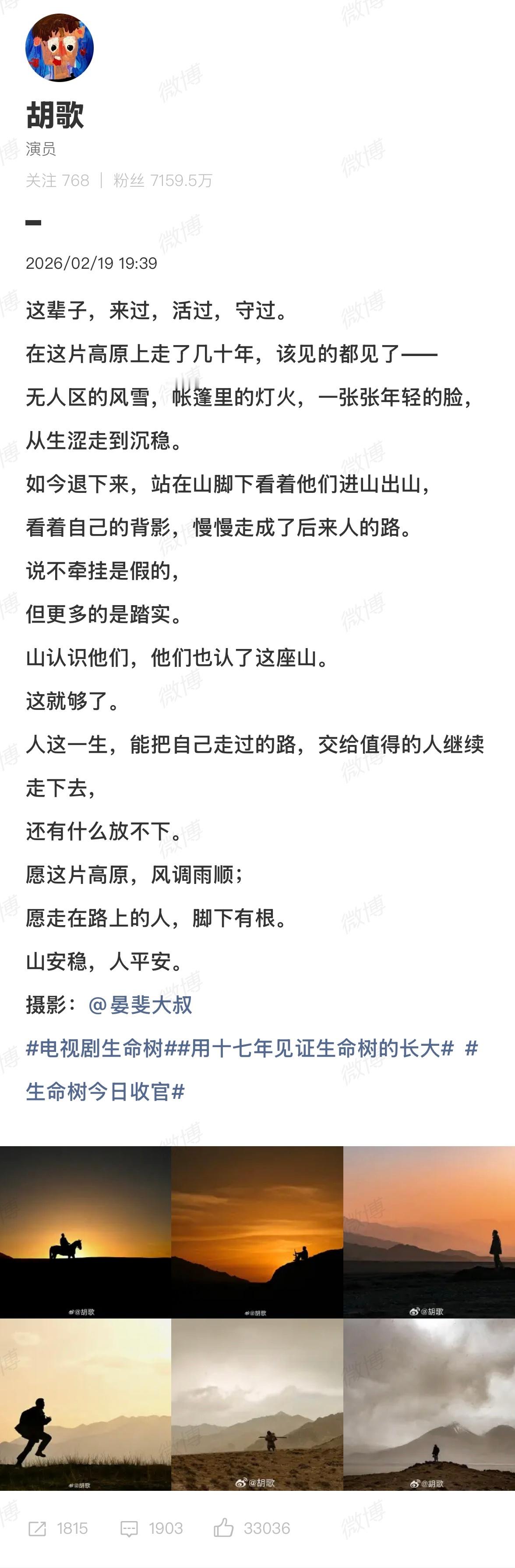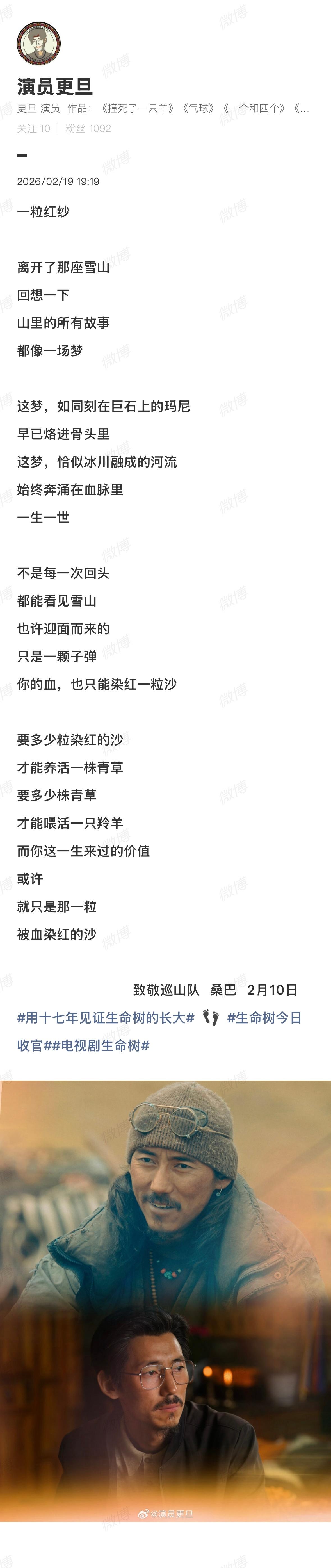 生命树大结局追完了生命树心里空落落的,这几年没有哪部剧能让我如此印象深刻,对剧里的每个人都熟悉的好像身边的朋友白菊,找到队长以后心结放下来了吗?多杰,有人接过了你肩上的使命你看到了吗?林培生,湖水都照不出你的影子了,欺骗大家这么多年良心不会痛吗?邵云飞,你小子真幸福啊!扎措、老韩、桑巴…等了这么多年,以后终于可以安稳过日子了每一个角色都塑造的好,恭喜🎉每一位演员,以后都多拥有了一个属于自己的人生角色时间终会验证,生命树不是生在地上,是长在人心里,这就是伟大艺术作品的生命力!