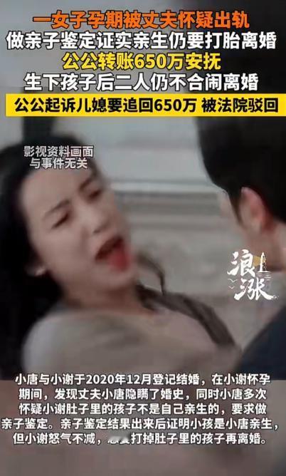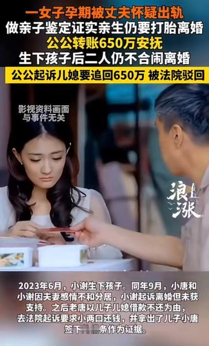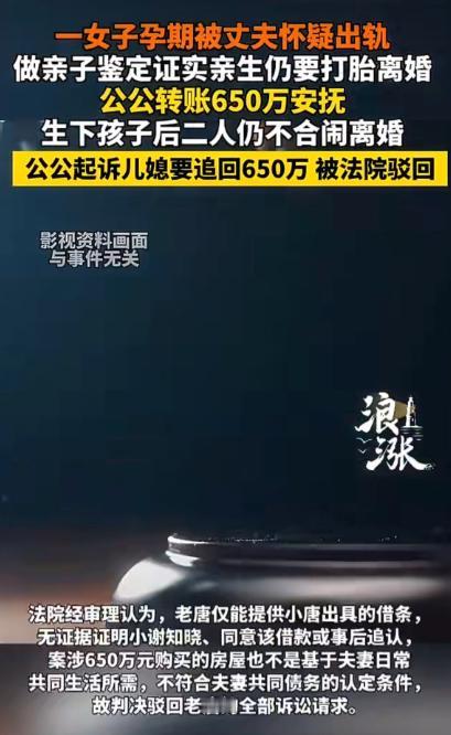 丈夫隐瞒婚史,却转头怀疑妻子肚子里的孩子不是自己的,检测结果出来,男子被打脸,妻子却铁了心要打掉孩子离婚,公公反手给儿媳账户转了650万“安抚费”,可没想到最后一家子居然对簿公堂。 事情发生在上海,小唐和小谢是在2020年12月登记结婚的,两人结婚时,公公老唐就格外大方,早就提前备好了一套价值千万的婚房,装修、家具一应俱全,就等着小两口领证入住、生儿育女,安稳过日子。 那时候,周围人都羡慕小谢嫁得好,不仅丈夫踏实,公公还这么给力,没人能想到,这份看似美满的婚姻,会在小谢怀孕后彻底崩塌。 就在小谢怀上孩子,一家人还沉浸在即将添丁的喜悦中时,两个猝不及防的大雷,接连炸在了小谢身上。 先是她无意间发现,自己的丈夫小唐,竟然一直瞒着她一件大事——他之前有过一段婚史,这段婚史小唐从来没有主动提起过,哪怕是两人谈婚论嫁、商量彩礼婚房的时候,也始终守口如瓶,一直瞒着她。 得知真相的小谢瞬间懵了,她无法接受自己朝夕相处、即将共度一生的人,竟然对自己隐瞒这么重要的事情,心里第一次产生了隔阂。 可让她更寒心的还在后面,小唐自己隐瞒婚史在先,心里心虚,非但没有主动道歉、求得小谢的原谅,反而反过来疑神疑鬼,多次怀疑小谢肚子里的孩子不是自己的。 直到亲子鉴定报告出来,白纸黑字写得清清楚楚,孩子就是小唐亲生的,所有的怀疑都被推翻,小唐本该愧疚道歉,可小谢的心,却已经凉透了。 信任这东西,就像一张纸,皱了就算抚平,也会留下痕迹,碎了就再也拼不回去了。 眼看好好的家就要散了,自己盼了很久的孙子也要没了,公公老唐急坏了,他知道,这件事从头到尾都是自己的儿子有错在先,是小唐的隐瞒和猜忌,才把儿媳推到了这个地步。 为了弥补儿媳所受的委屈,保住孙子,挽回这段即将破碎的婚姻,老唐决定出手挽回。从2023年4月到6月,短短两个月的时间里,他分三次,往小谢的个人账户里转了共计650万,每一次转账的备注都清清楚楚、明明白白地写着“购房款”,没有一丝含糊。 这笔钱到账后,小谢很快就用它在上海徐汇区买了一套学区房,而且这套房子的产权,只写了小谢一个人的名字,和小唐没有半点关系。 明眼人都看得出来,老唐这哪里是给“购房款”,分明是在替儿子“赎罪”,想用这650万的巨款,抚平小谢心里的委屈,稳住她的心。 或许是老唐的诚意起到了一丝作用,或许是小谢舍不得肚子里的孩子,最后她没有打掉孩子,在2023年6月顺利生下了宝宝。可所有人都清楚,夫妻之间的裂缝,一旦出现,就很难用金钱弥补,用钱糊上的裂缝,终究还是会裂开。 孩子的出生,并没有修复两人之间的感情,反而让之前的矛盾变得更加突出,争吵、冷战成了家常便饭,两人之间再也没有了当初的温情。 2023年9月,也就是孩子出生三个月后,小唐和小谢正式分居,小谢再次提出离婚,并且直接向法院提起了离婚诉讼,只不过这一次,因为各种原因,法院没有判决离婚,两人的婚姻关系,就这样名存实亡地拖着。 老唐看着儿媳去意已决,知道自己再怎么挽回也没用,之前转出去的650万巨款,他也不想白白损失,于是转头就变了脸,把自己的儿子小唐和儿媳小谢一起告上了法庭,要求两人共同归还这650万“借款”,还要加上相应的利息。 庭审的时候,三方各执一词,闹得不可开交。老唐辩称,这650万是小谢以打胎相要挟,向自己借的钱,并不是什么安抚费,还向法院提交了儿子小唐单方签下的借条作为核心证据。 小唐则全程站在自己父亲一边,对借款的事实没有任何异议,同意父亲的诉讼请求,愿意和小谢一起偿还这笔钱,还声称这笔钱是自己和小谢商量好后,一起向父亲借的。 可小谢却坚决反驳,她表示,这笔650万的款项,根本不是借款,而是老唐因为儿子隐瞒婚史、猜忌自己的过错,对自己进行的补偿,是无偿赠予给她的个人财产,她从来没有以打胎相要挟借钱,而且那张借条,她根本不知情,也没有签过字,事后也没有追认过这笔借款。 更重要的是,老唐每次转账的备注都是“购房款”,而不是“借款”,加上这套用这笔钱买的学区房,只登记在她一个人名下,足以证明这笔钱是赠予,而非借款。 经过详细的审理和调查,上海徐汇区人民法院最终做出了判决,驳回了老唐的全部诉讼请求。 法院认为,老唐只能提供儿子小唐单方出具的借条,没有任何证据证明小谢知晓这笔借款、同意借款,或者事后追认过这笔借款,而且这650万用来购买的学区房,登记在小谢个人名下,并不是用于夫妻日常共同生活所需,不符合夫妻共同债务的认定条件,所以老唐要求两人共同偿还650万及利息的诉求,没有事实和法律依据,不予支持。 一场牵扯着亲情、爱情和金钱的闹剧,最终以老唐败诉收场,原本亲密的一家人,彻底撕破了脸,再也没有了缓和的余地,好好的家庭,就这样毁在了猜忌和算计里。