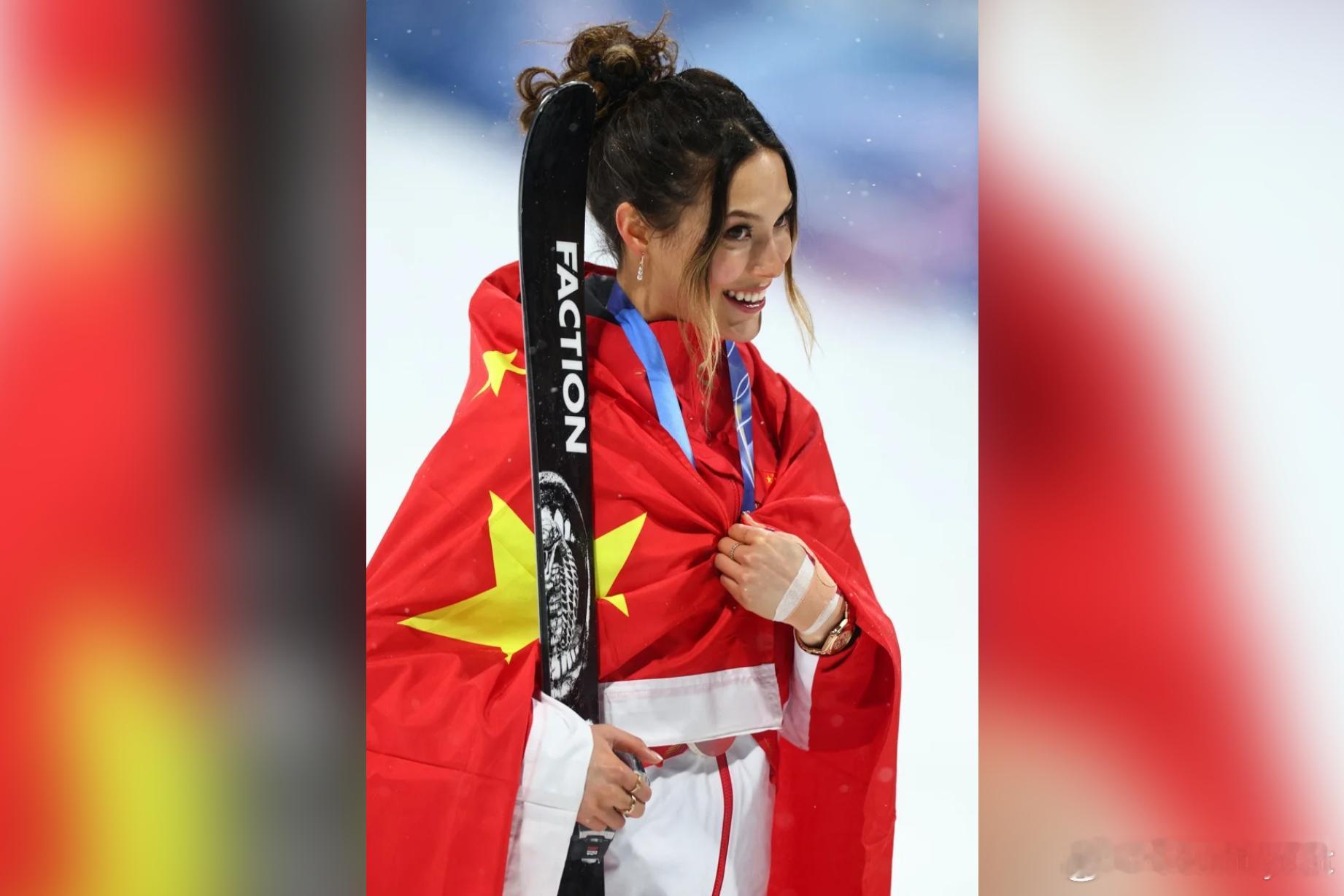 图:代表中国的选手谷爱凌16日在米兰冬奥上自由式滑雪女子大跳台决赛中,摘得个人本届冬奥会第二枚银牌,披上中国五星旗。 (路透)