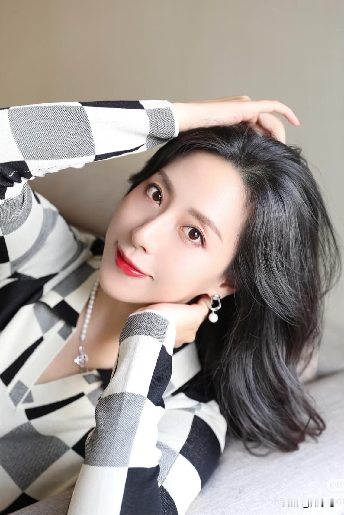 优雅黑发,迷人红唇,时尚无袖针织衫,尽显女性魅力。