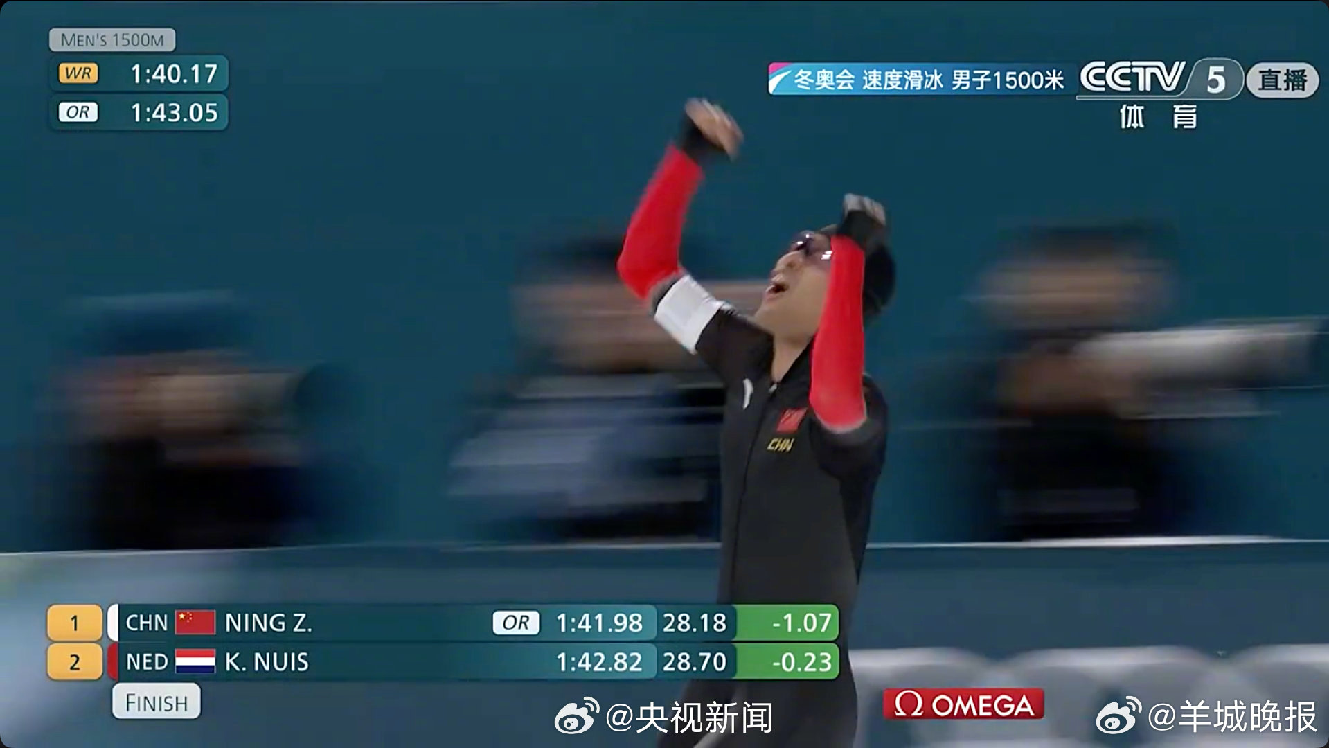 【#宁忠岩破奥运纪录夺金#】#中国队第三金来了#米兰冬奥会速度滑冰男子1500米,中国选手宁忠岩1分41秒98夺金,打破奥运纪录,飞翔的中国人!