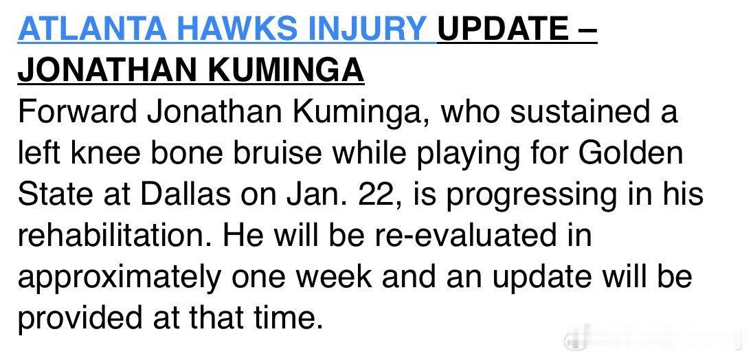 老鹰官方宣布,库明加左膝伤病进展顺利,但再至少缺席一周。