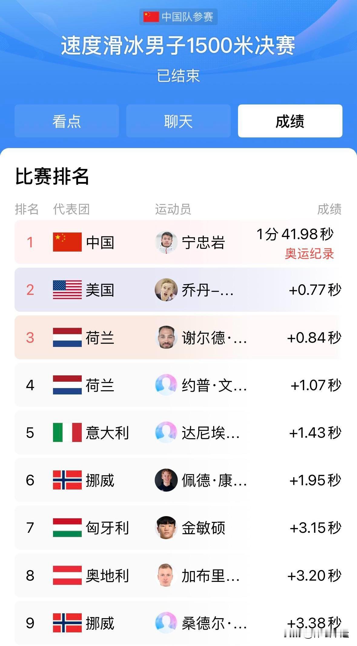 🎉🎉旗手宁忠岩为中国冰雪军团夺得第三枚金牌🎖️🔥🔥🔥 2月20日的米兰冬奥会速度滑冰男子1500米决赛太燃了!中国选手宁忠岩简直神了,直接滑出1分41秒98的成绩,不仅打破奥运纪录,还一举夺金,这可是米兰冬奥会中国的第三金啊! 赛场上他风驰电掣,每一个弯道的超越、每一次加速都让人看得热血沸腾。另一位中国选手刘瀚彬第9组出战,最终1分49秒00完赛。虽然成绩和宁忠岩有差距,但他也在赛场上拼尽了全力。宁忠岩这一破纪录夺金,太提气了,为国争光实至名归!