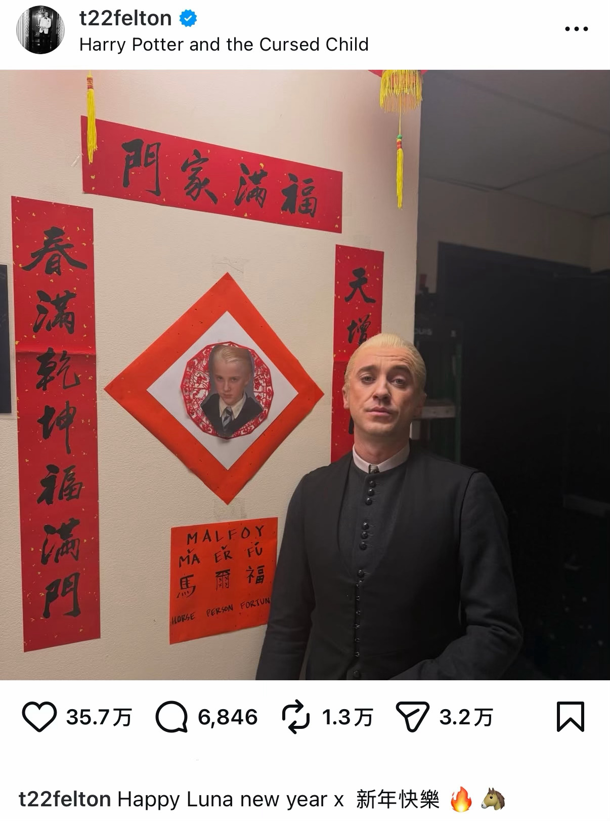 昨日,“马尔福”汤姆·费尔顿继续大玩“马尔福”梗,在个人ins账号晒出贴「马尔福」福字与春联的照片,而他将原本的配文「Happy Chinese new year」改成「Happy Luna new year」引发热议,有不少中国网友在他的评论区留言指正,目前他已经把文案改回来了。春节档马上有戏