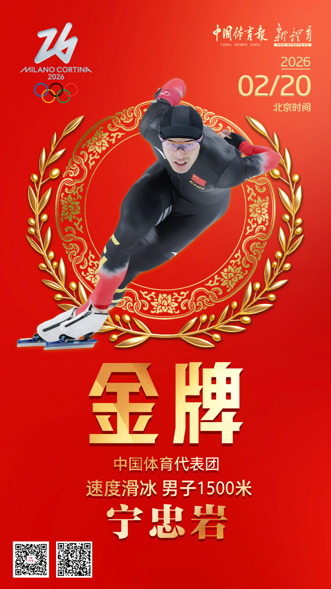 第三金 !!!宁忠岩以打破奥运会纪录的成绩拿下米兰冬奥会速度滑冰男子 1500 米金牌 !!!🏅