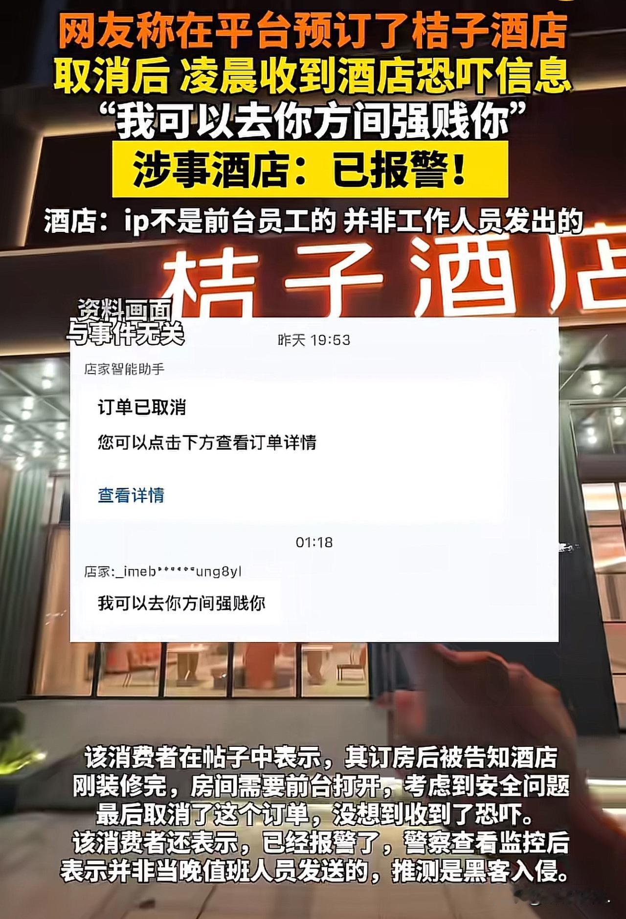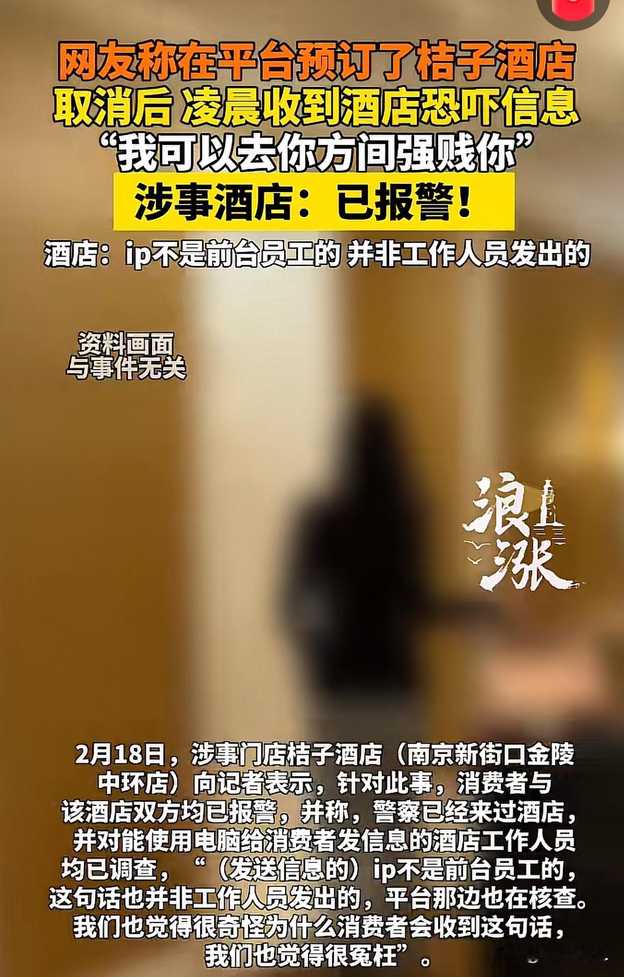 “太可怕了!”南京,女子在网上预定了某酒店的房间,随后,发现该酒店刚完成装修,出入不是很方便,于是,取消了订单。谁知,凌晨1点多,手机上突然收到该酒店员工发来的消息:“我可以去你方间强贱你!”女子看后,害怕极了,赶紧报警。涉事酒店回应,不是该酒店员工发的,他们也很冤枉。目前,警方正在介入调查。 出门在外,女子对住的地方格外用心,毕竟涉及到安全问题,但万万没想到,怕什么来什么,竟发生了一件意想不到的事情,让她一阵阵后怕。 女子利用假期,出来旅游,放松一下心情。为了有了更好的居住体验,她千挑万选,选中了一家各方各方面都不错的酒店。 接着,她通过线上平台,预订了桔子酒店南京新街口金陵中环店2月18日至19日的客房。 可预订后她发现,这家酒店刚完成装修,入住时还需要前台工作人员帮忙开门才能进入房间。 考虑到刚装修的环境、陌生的入住流程,女子心里泛起了嘀咕,出于自身安全的顾虑,最终决定取消这笔订单。 她本以为自己这是在再正常不过的行为,可谁也没想到,噩梦就此开始。 订单取消后,女子并没有把此事放在心上。 可到了次日凌晨1点多,夜深人静之时,手机突然弹出一条信息,发信方显示为酒店相关渠道,内容却充满恶意恐吓,让人看了不寒而栗。 上面写着:我可以去你方间强贱你! 女子又惊又怕,凌晨时分也不敢耽搁,立刻选择报警,希望警方能介入查清真相,给自己一个说法。 此事很快引发关注,2月18日,涉事的桔子酒店南京新街口金陵中环店正式对外回应。 门店工作人员表示,事发后消费者已经报警,酒店方面也主动报了警,警方第一时间赶到门店展开调查。 工作人员配合警方,对当晚所有能够操作电脑、接触客户信息的在岗人员逐一进行排查,调取操作记录、核查设备IP,初步确认发送恐吓信息的IP地址并非酒店员工使用,这条恶劣信息也不是门店工作人员发出的。 酒店方面对此大喊冤枉。 同时,酒店透露,合作的携程平台也在同步开展核查工作,配合查清信息发送的源头。 门店还特别说明,该店刚完成装修,目前还处于试营业阶段,员工都在正常开展工作,无论是从职业规范还是个人动机来看,工作人员都没有理由做出发送恐吓信息这种极端行为。 截至目前,警方的调查仍在进一步推进中,恐吓信息究竟从何而来、是何人所为、是否涉及酒店系统安全漏洞,还有待官方给出最终结论。 这件事曝光后,网友给出两种看法 恐吓信息精准发给订房人,除了酒店内部谁能拿到联系方式?一句“不是员工发的”就想撇清关系,未免太敷衍!试营业就敢出这种事,客户信息安全毫无保障,就算不是员工亲手发,也是酒店系统烂、管理烂,别再装无辜了! 也别一棍子打死,取消订单得罪人是有可能,但直接发这种违法恐吓信息,风险极大,员工确实没这个动机。不排除是外部黑客、恶意竞争对手搞鬼,故意栽赃酒店。 《治安管理处罚法》第42条:有下列行为之一的,处五日以下拘留或者五百元以下罚款;情节较重的,处五日以上十日以下拘留,可以并处五百元以下罚款:(一)写恐吓信或者以其他方法威胁他人人身安全的。 发送包含性 侵,人身伤害内容的恐吓信息,已经明显威胁到他人人身安全,违反上述法律规定。 无论发送者是酒店员工还是其他人员,一旦查实,公安机关可依法予以拘留、罚款;若情节恶劣,还可能涉嫌刑事犯罪。 同时,酒店对客户信息与沟通渠道负有管理安全责任,即便不是员工直接发送,也需承担相应的管理与安全保障义务。