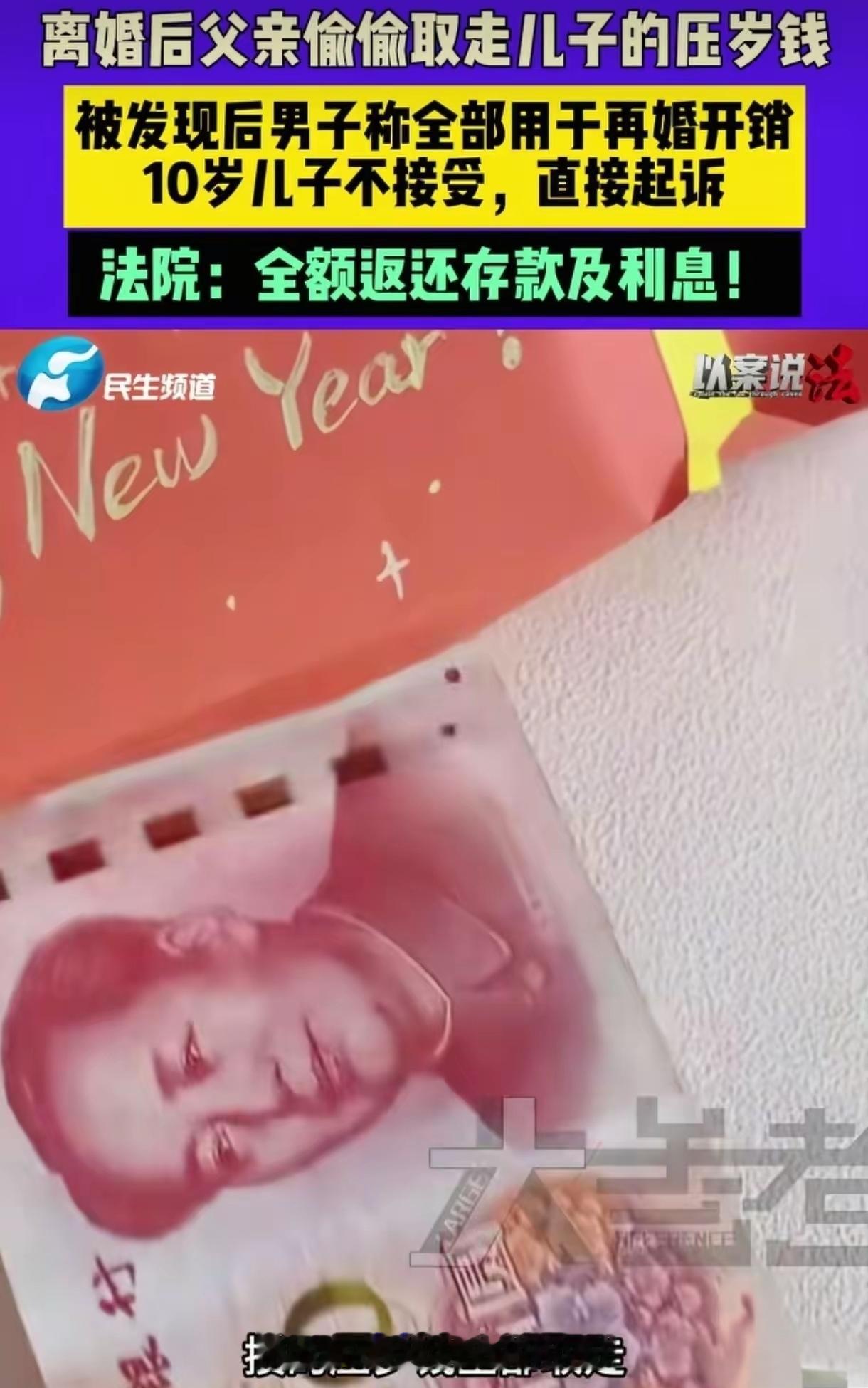 “你是我儿子,你的钱就是我的钱!”父亲再婚缺钱,擅自取走孩子8万压岁钱,结果万万没想到…… 河南郑州有个10岁男孩小辉,原本生活在一个完整的家里,可后来爸妈感情破裂离了婚。离婚后,小辉跟着爸爸生活。没多久,爸爸又结了婚,小辉就跟着爸爸和后妈一起过。可后妈毕竟是后妈,日子过得没那么顺心,小辉心里也挺不是滋味。 后来经过一番折腾,小辉最后还是回到了妈妈身边。本来以为生活终于能消停点了,结果在收拾东西的时候,小辉妈妈发现了一个大问题——小辉从小到大攒的那些压岁钱,全没了! 说起来,小辉这压岁钱可不少。每年过年,爷爷奶奶、外公外婆、七大姑八大姨给的,爸妈当初没离婚时也帮他存着,这些年攒下来也有八万多块。这笔钱一直存在银行里,是小辉的一份“家底”。 小辉妈妈赶紧去查,结果发现钱早就被取走了,取钱的人正是前夫——小辉的亲爸! 小辉知道这事儿后,又急又委屈,眼眶都红了。他跑去问爸爸为啥要动他的钱。结果爸爸一脸无所谓,说:“我结婚需要用钱,就先拿着花了。再说了,你是我儿子,你的钱不就是我的钱吗?” 这话听得小辉心里拔凉拔凉的。那些压岁钱,可是长辈们给他的一份份心意,是他一点点攒起来的“小金库”。爸爸怎么能不打招呼就拿走呢?他让爸爸还钱,可爸爸死活不同意,觉得这事没啥大不了的。 小辉越想越气,在妈妈的支持下,他做出了一个大胆的决定——把亲爹告上法庭,要求返还自己的存款和利息! 这事儿传出去后,网友们炸开了锅。有人说这爹也太不靠谱了,拿着儿子的钱去娶后妈,这不是坑孩子吗?也有人说,父母离婚后,孩子的压岁钱就该归孩子自己,谁动都不合适。 说实话,当爹的再婚手头紧,可能有他的难处。但再难,也不能打孩子压岁钱的主意啊!这笔钱对大人来说可能不算啥,但对一个10岁的孩子来说,那是他的全部家当,是他的安全感。 那么问题来了:孩子的压岁钱,到底归谁?父母能随便花吗? 法律上是这么说的:压岁钱属于长辈对孩子的赠与,一旦给出去,钱的所有权就归孩子本人了。孩子就算是未成年,这笔钱也是他的个人财产,不是父母的。 《民法典》里写得很清楚,父母作为监护人,职责是保护孩子的财产,只有在为了孩子利益的情况下才能动用。比如给孩子交学费、看病啥的,这没问题。但拿孩子的钱去给自己结婚、贴补家用,这就叫“侵犯财产权”,法院可不会惯着。 最后法院判了:父亲全额返还小辉的存款加利息,一共八万两千多块!这下可真是大快人心。 说到底,这事儿给所有家长提了个醒:孩子的钱是孩子的,当爹妈的再难,也不能把手伸得太长。你尊重孩子,孩子才会尊重你。不然,哪天被告上法庭,那就真成笑话了。 看完这个事儿,你小时候的压岁钱还在吗?是被爸妈“保管”得没了影,还是自己攒下来了?欢迎在评论区聊聊! (案例来源:河南郑州真实案例,综合自媒体报道)