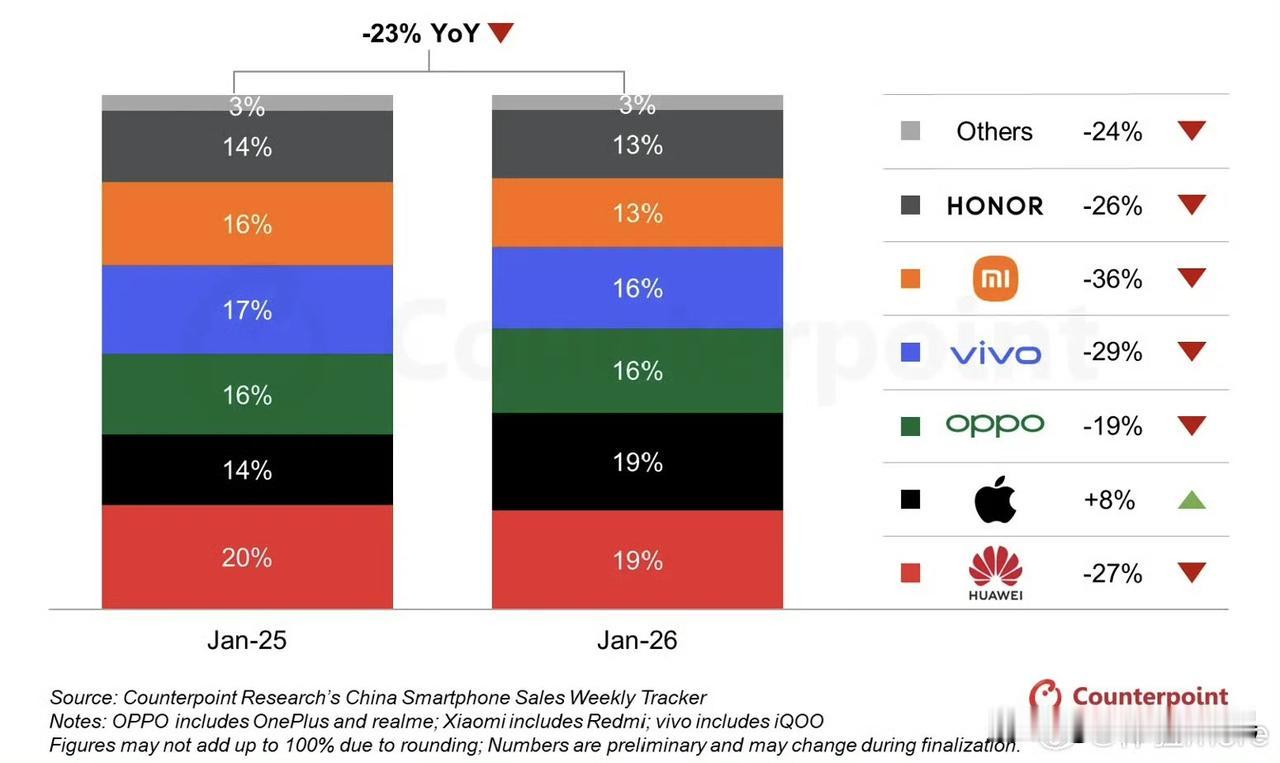 🔥2026年1月中国智能手机市场整体遇冷,销量同比大幅下降23%,主要受国补力度减弱、春节节点变化及手机涨价等因素影响,消费者换机意愿降低。 在市场整体下滑的背景下,品牌表现呈现明显分化。苹果成为最大赢家,凭借iPhone 17系列的强劲销售,逆势实现8%的同比增长,是主流品牌中唯一增长的厂商,凸显其在高端市场的强大竞争力。相比之下,国产Top5厂商形势严峻,均出现两位数的同比跌幅。其中,小米降幅最大,达36%;荣耀下降26%;vivo下降29%;OPPO下降19%;华为下降27%。 当前智能手机市场竞争加剧,各家在高端市场仍面临苹果的强力压制。未来,只有在技术创新、产品差异化及定价策略上寻求突破,才能应对消费疲软和激烈的市场竞争。