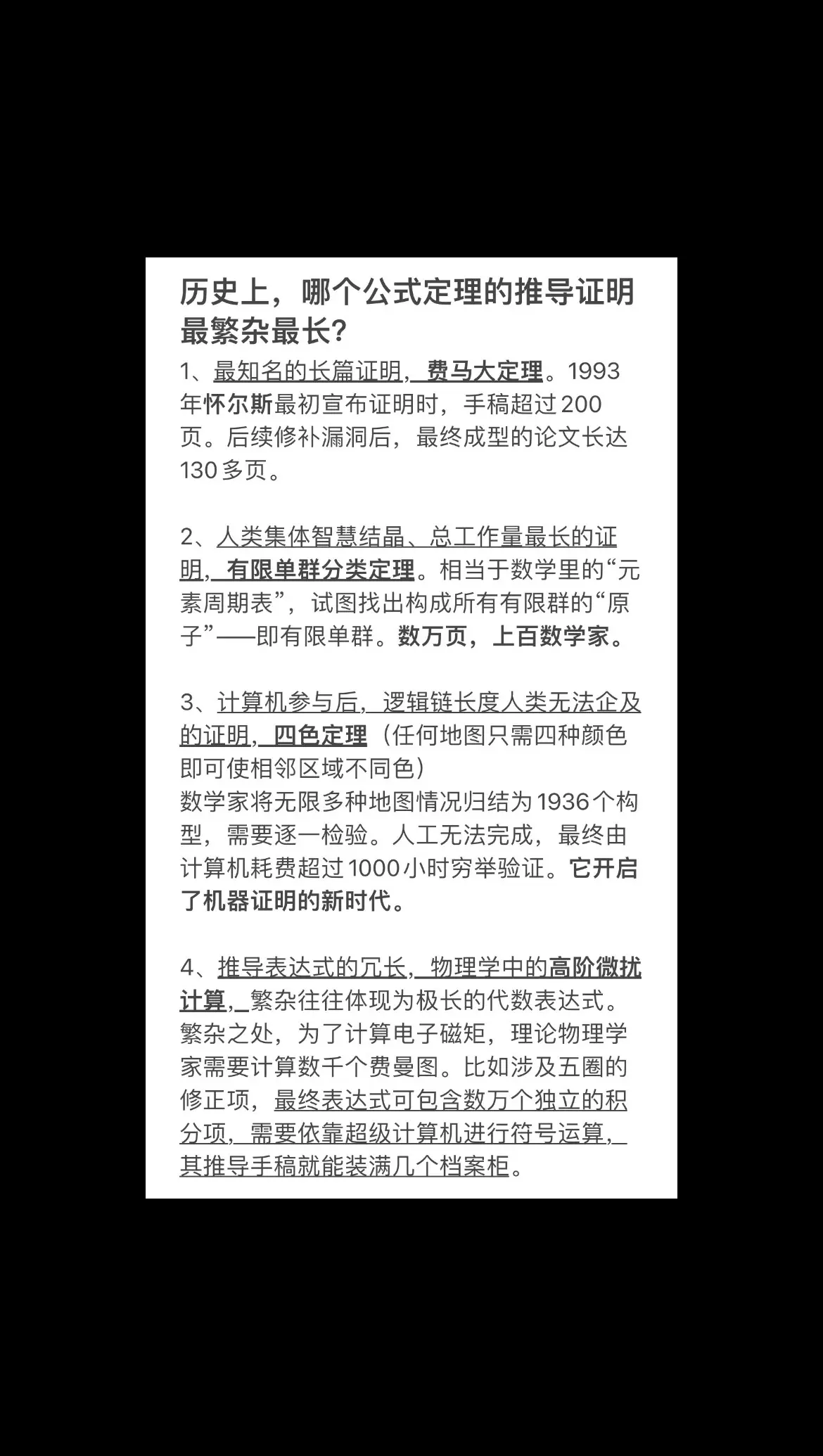 历史上,哪个公式定理的推导证明最繁杂最长?费马大定理四色定理有限单群分类高阶微扰计算公式证明