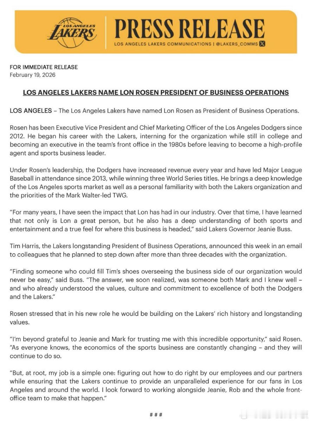 湖人任命Lon Rosen为球队新任商务运营总裁!