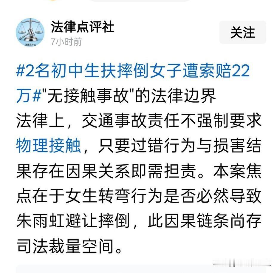 关于初中生扶起老人遭索赔一事,主因在于交通责任认定书 目前交警认定两初中生次责 这份交通责任认定书具有法律效力,如果法院在裁量中推翻不了这份裁定,那两个初中生赔钱给对方是赔定了 目前,双方各执一词,现场视频也在,一切都需要法院来裁定 很同情这两个初中生,但是情况很不乐观 当然,对方要22万,也只是对方的要求而已 目前舆论近乎冰火两重天 就看法院的主审法官在看了视频之后回如何裁量了