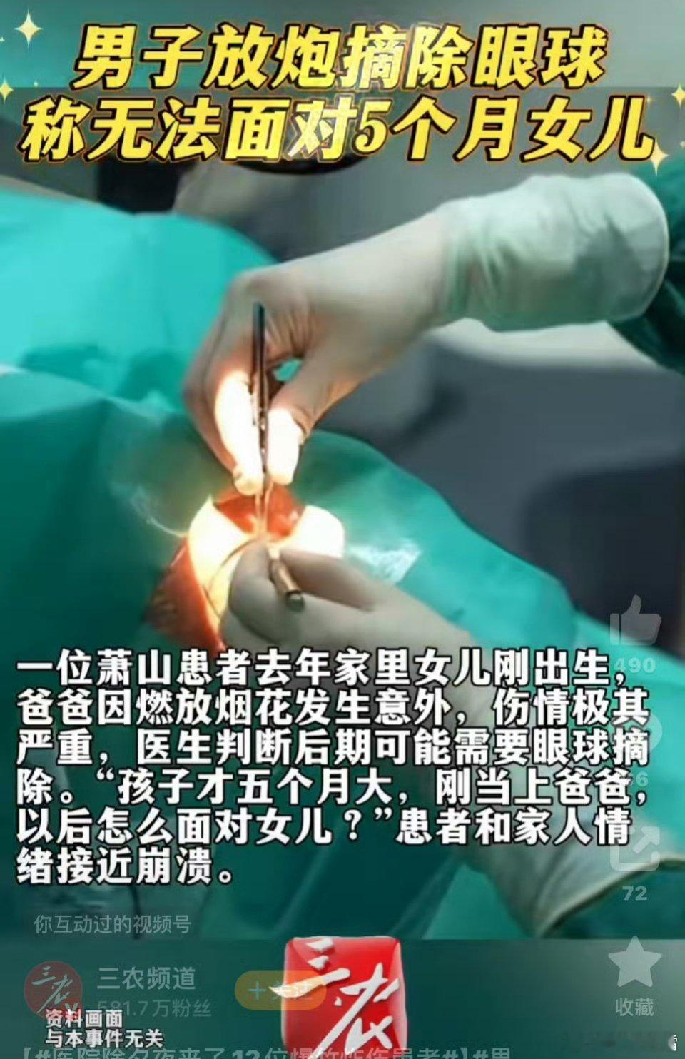男子放炮摘除眼球称无法面对5个月女儿看到杭州这位刚当爸爸的年轻人,因放烟花被炸伤面临摘除眼球,一句“以后怎么面对五个月大的女儿”,听得都让人揪心。年味很重要,但安全永远是第一位的。每年除夕,都是医院眼科、外科最忙的时候,多少家庭因为一时疏忽,从团圆喜庆变成终身遗憾。放烟花图的是开心,不是赌运气,更不能拿自己和家人的未来冒险。我们理解大家对年俗的感情,但任何快乐都不能以伤害为代价。提醒所有人:正规产品、规范操作、远离人群、做好防护,别让一时大意,毁掉一整个家的幸福。愿伤者早日挺过难关,也愿这样的悲剧,越少越好。滚滚锐评男子放炮摘除眼球称无法面对5个月女儿