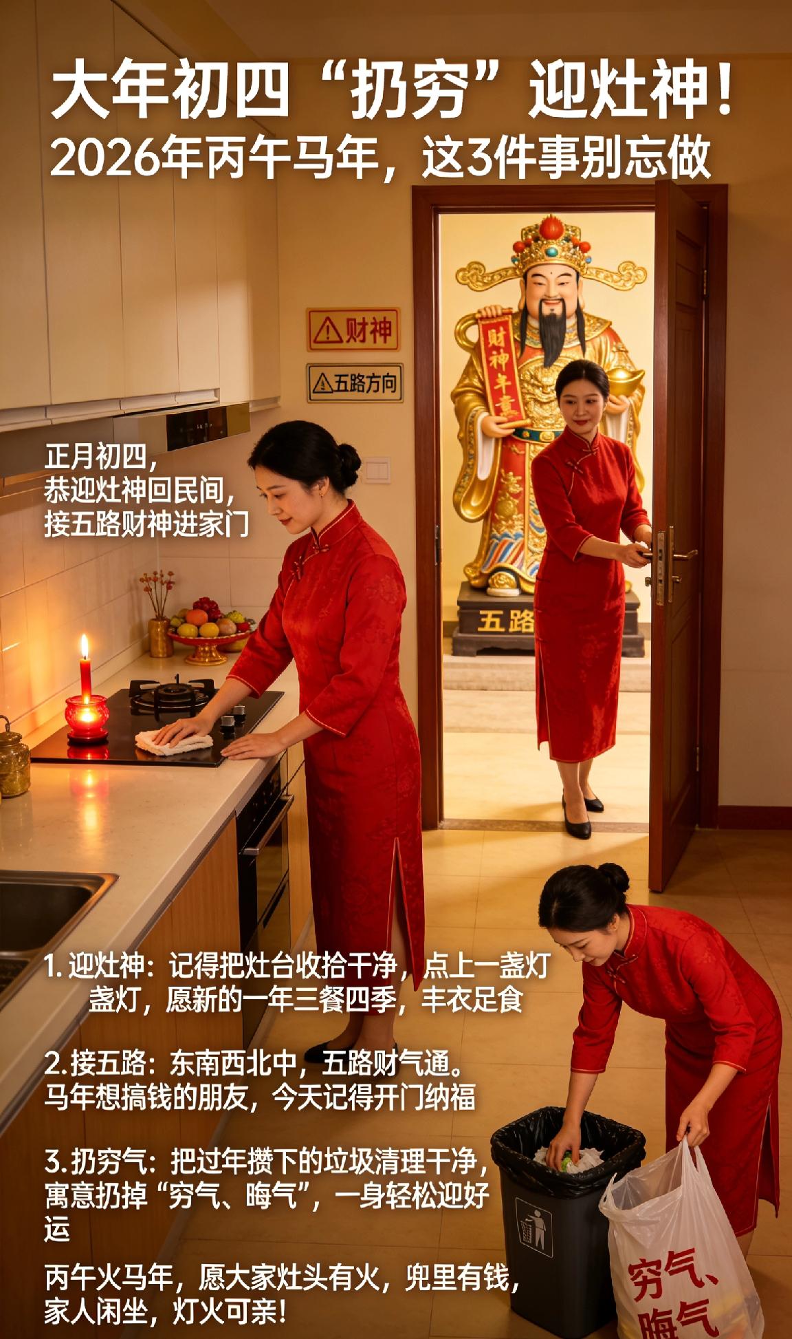 大年初四“扔穷”迎灶神!丙午马年,这3件事别忘做🧧 正月初四,恭迎灶神回民间,接五路财神进家门! 在这个“羊日”里,老祖宗的规矩藏着大福气: 1. 迎灶神: 记得把灶台收拾干净,点上一盏灯,愿新的一年三餐四季,丰衣足食。 2. 接五路: 东南西北中,五路财气通。马年想搞钱的朋友,今天记得开门纳福! 3. 扔穷气: 把过年攒下的垃圾清理干净,寓意扔掉“穷气、晦气”,一身轻松迎好运。 丙午火马年,愿大家灶头有火,兜里有钱,家人闲坐,灯火可亲! 大年初四 接灶神