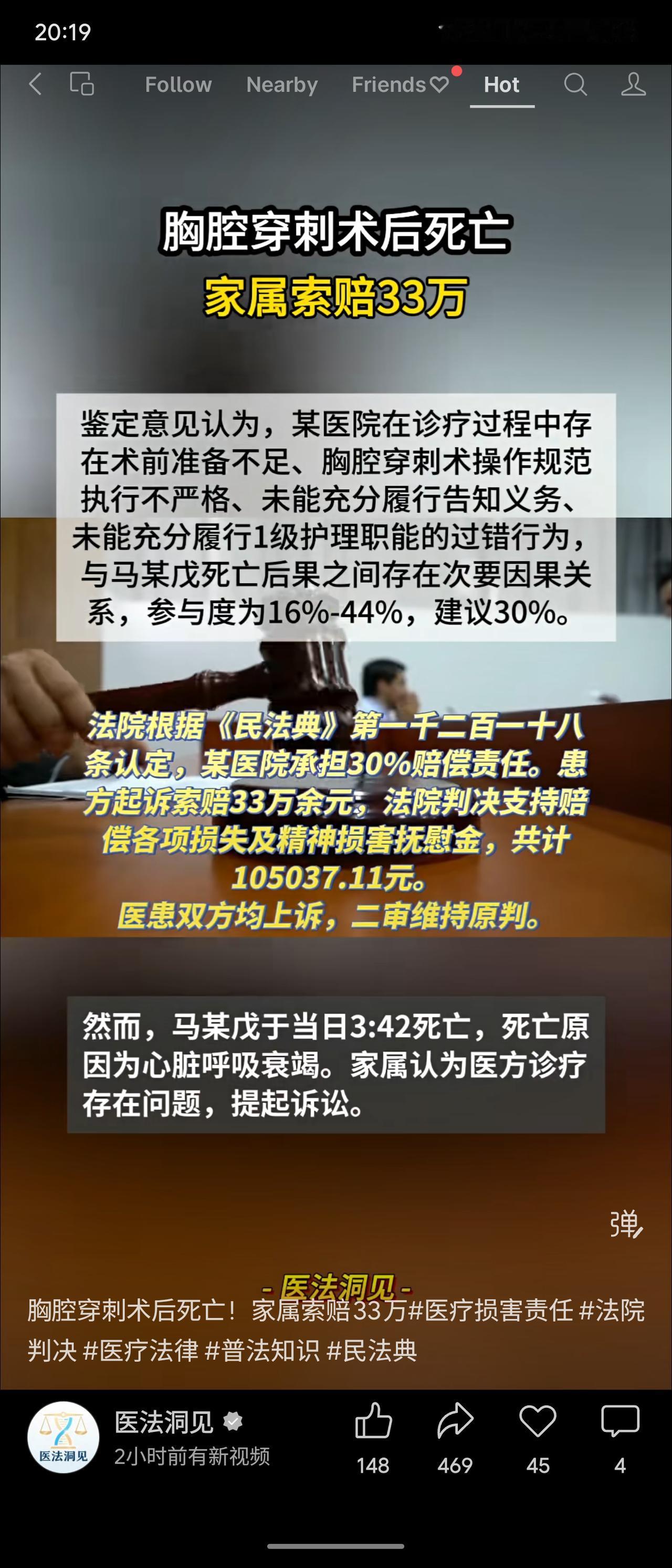 集卡领红包82岁患者因慢阻肺入院,行胸腔穿刺术后死亡。鉴定认定医方术前准备、操作规范、告知义务及一级护理存在多项过错,与死亡有次要因果关系。法院判医院承担30%责任,赔偿10.5万余元,二审维持原判。