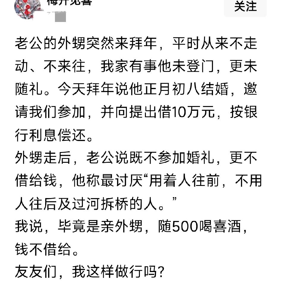 外甥还没结婚,舅舅怎么就说外甥过河拆桥呢,外甥有困难找舅舅很正常呀,这种情况下舅舅做事不得看一奶同胞的姐妹吗?有能力就适当帮点儿,没能力就不帮也不要说的那么难听,我看这舅舅就是个六亲不认的主,还不如舅妈有格局。 外甥还没结婚,舅舅怎么就说外甥过河拆桥呢,外甥有困难找舅舅很正常呀,这种情况下舅舅做事不得看一奶同胞的姐妹吗?有能力就适当帮点儿,没能力就不帮也不要说的那么难听,我看这舅舅就是个六亲不认的主,还不如舅妈有格局。 你老公跟他姐妹有没有走动呢,如果有就要随礼喝喜酒,钱借不借根据自身实力和平时跟姐妹的交情,如果跟外甥的母亲从没有走动,估计没有亲情或者有很深的隔阂,就被不必了。亲戚之间平常不与人走,有事的时候临时抱佛脚,临时烧香,临时磕头。这样的亲戚,不帮也罢!外甥来舅家 跟舅舅最起亲 外孙舅舅关系 外甥终身大事 外甥女照顾舅舅 外甥女请舅舅 外甥过新房