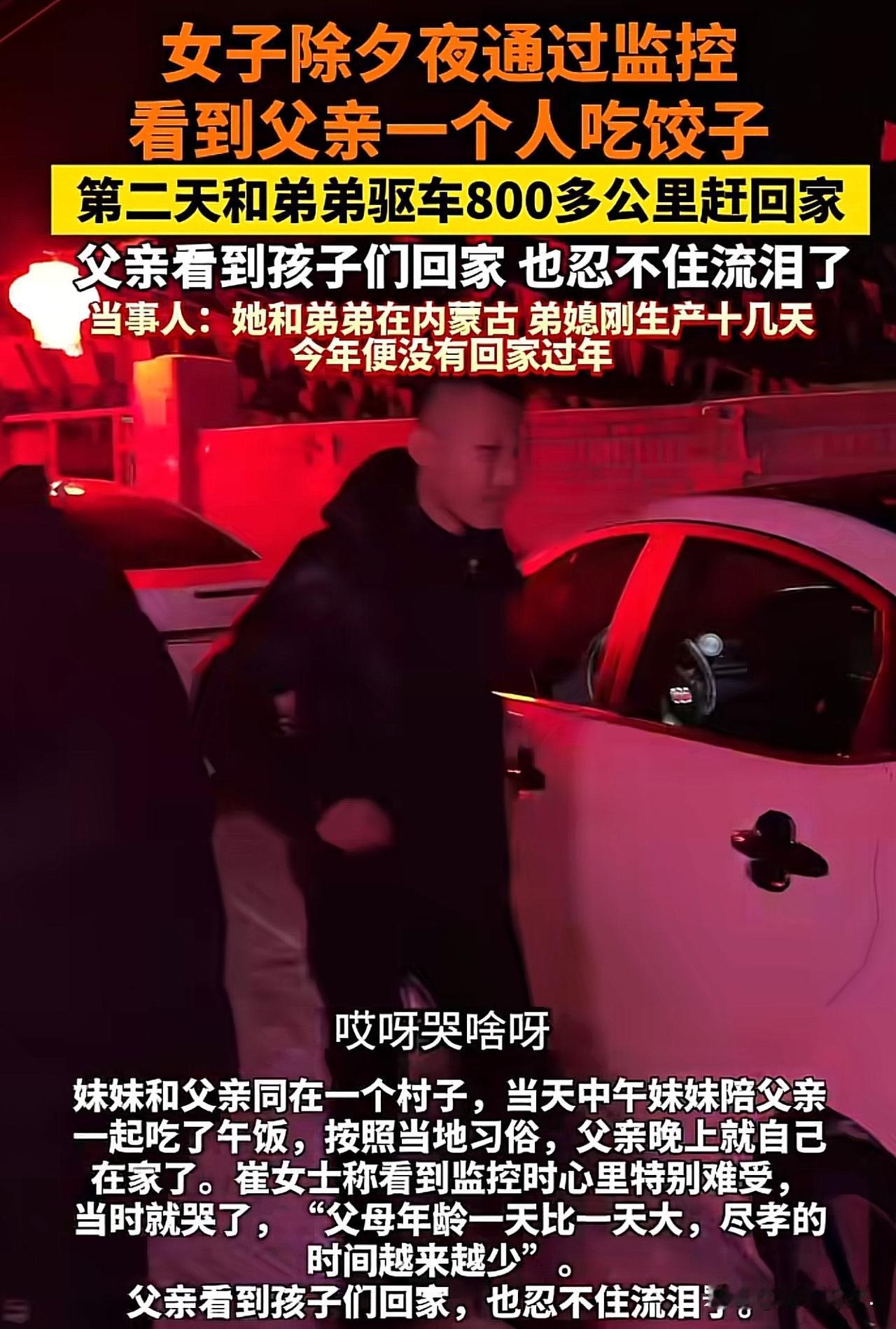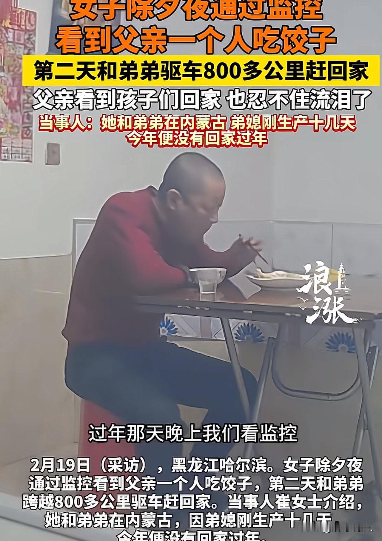 哈尔滨,男子除夕夜独自在家吃饺子,远在内蒙古的大女儿看到了这一幕,心里不是滋味,流下了眼泪。第二天,赶紧和同在内蒙古的弟弟商量,回去看望父亲。弟弟犯难,毕竟妻子刚生完孩子10多天,不宜舟车劳顿。没想到,妻子很通情达理,知道后,马上支持丈夫回去看望公公。随后,大女儿和儿子驱车800多公里归家,男子看到儿女回来了,流下了眼泪。 大年三十除夕夜,本是一家人围坐在一起吃团圆饭、热热闹闹过年的日子,远在内蒙古的崔女士,忍不住点开了老家哈尔滨的监控,想看看老父亲过得怎么样。 这一看,崔女士的眼泪瞬间就掉了下来。 监控里,空荡荡的屋子里,老父亲一个人坐在桌前,安安静静地吃着一碗饺子,没有欢声笑语,没有家人陪伴,就这么孤零零地吃着年夜饭。 崔女士和弟弟都在内蒙古安家,原本计划回家过年,可弟媳刚生完孩子十几天,身体虚弱,实在不方便长途奔波,姐弟俩只好留在外地,无法陪父亲过年。 其实同村的妹妹中午已经来陪父亲吃过午饭,按照老家习俗,除夕夜晚上父亲要自己在家吃饺子。可即便知道是当地风俗,看着父亲独自吃饭的背影,崔女士心里还是揪得生疼,一整晚都没睡着,越想越难受。 她心里清楚,父母年纪越来越大,能陪在他们身边的日子,过一天少一天,尽孝真的不能等。 除夕当晚哭了一夜后,大年初一一早,崔女士就和弟弟商量,能不能尽快回家。 弟弟听后心里也十分不是滋味,恨不得立刻回到父亲身边,他赶紧把自己的想法告诉了妻子。 好在弟媳十分通情达理,她也心疼公公独自一人过年,加上自己坐月子期间婆婆已经过来照顾,留下公公孤零零的,她当即同意丈夫赶紧回去。 于是,姐弟俩不再犹豫,立刻收拾东西,驱车800多公里,一路向着老家赶去。 老父亲得知儿女要回来,早早地就站在门口等候,眼巴巴地望着路口的方向。等姐弟俩终于赶到家,推开车门见到父亲的那一刻,一家人再也忍不住,眼泪哗哗地流了下来。父亲看着突然出现在眼前的儿女,又是惊喜又是心疼,布满皱纹的脸上,泪水止不住地往下淌,这一路的奔波辛苦,在见到父亲的瞬间,全都值得了。 一碗除夕的饺子,一段800公里的归途,没有惊天动地的大事,只是最普通的一家人,最朴素的牵挂。 父母在,家就在,能早点陪在他们身边,就别再等了。 从法律层面来说,《民法典》第26条第2款明确规定,成年子女对父母负有赡养、扶助和保护的义务。 《老年人权益保障法》第14条也指出,赡养人应当履行对老年人经济上供养、生活上照料和精神上慰藉的义务,照顾老年人的特殊需要。 民法典将赡养定为法定义务,不附加任何条件。崔女士看到监控后连夜驱车800公里回家,正是对法律精神的践行:物质赡养是底线,精神陪伴是责任。父母年迈,陪伴的机会越来越少,及时尽孝既符合传统孝道,也契合法律对家庭伦理的保护。 此事曝光后,网友们也给出了不同的看法。 有网友站在弟媳妇的角度表示:这个大姑姐有点事儿多,弟媳刚生产十几天,身体还很虚弱,大姑姐想回家尽孝可以自己回去,没必要把弟弟也叫走,把月子里的孩子和产妇丢在一边,何况父亲身边还有同村的妹妹照顾。 也有网友提出批评,认为这种行为属于愚孝:有些人总打着孝顺的旗号,满足自己的面子和虚荣心,甚至去干涉别人的生活,其实是在搅乱一家人的安宁。老年人有老年人的生活,年轻人有年轻人的难处,忙了一年彼此都需要休息,不该用所谓的孝顺去绑架他人。 但更多网友被这份亲情打动:看到监控里爸爸一个人吃饺子的瞬间,真的破防了。还好你们立刻就赶回去了,这800公里的路程,是对亲情最温暖的回应。常回家看看,别让爱等太久。 欢迎关注@解豸说法. 百行德为首,万事法为先?