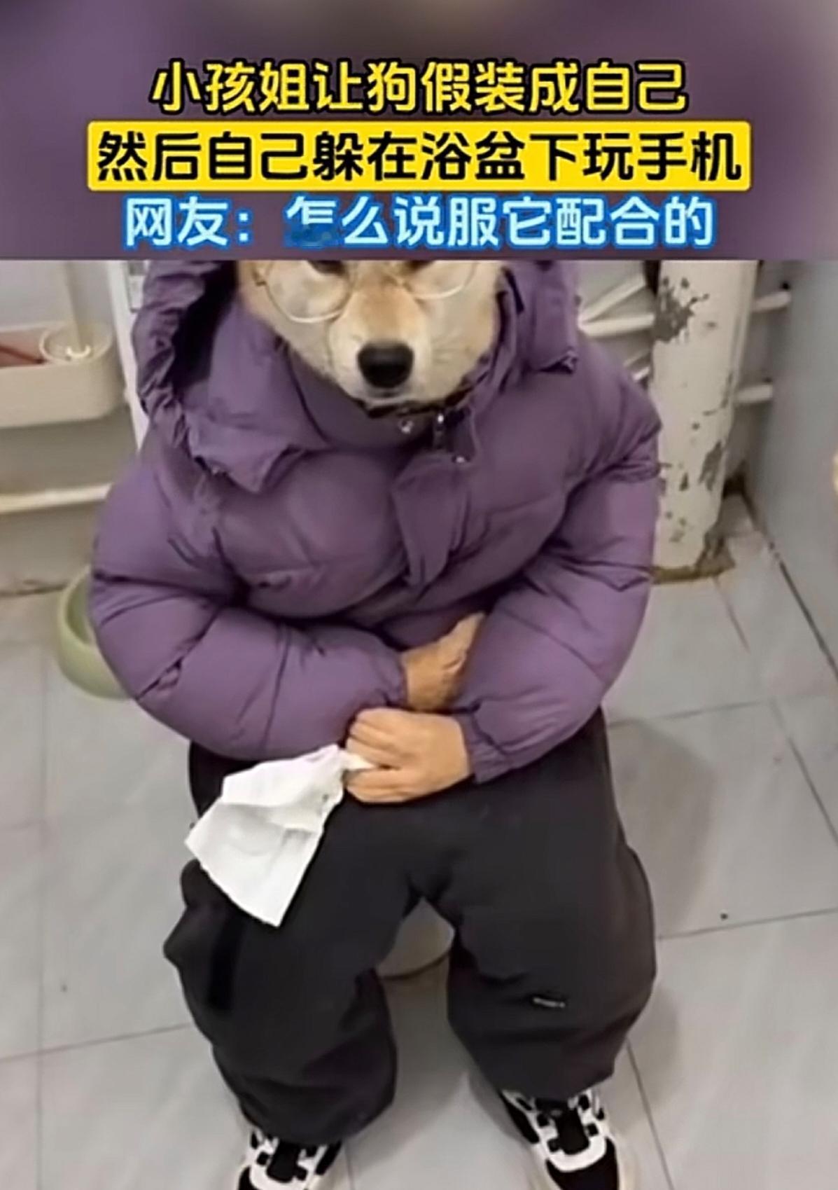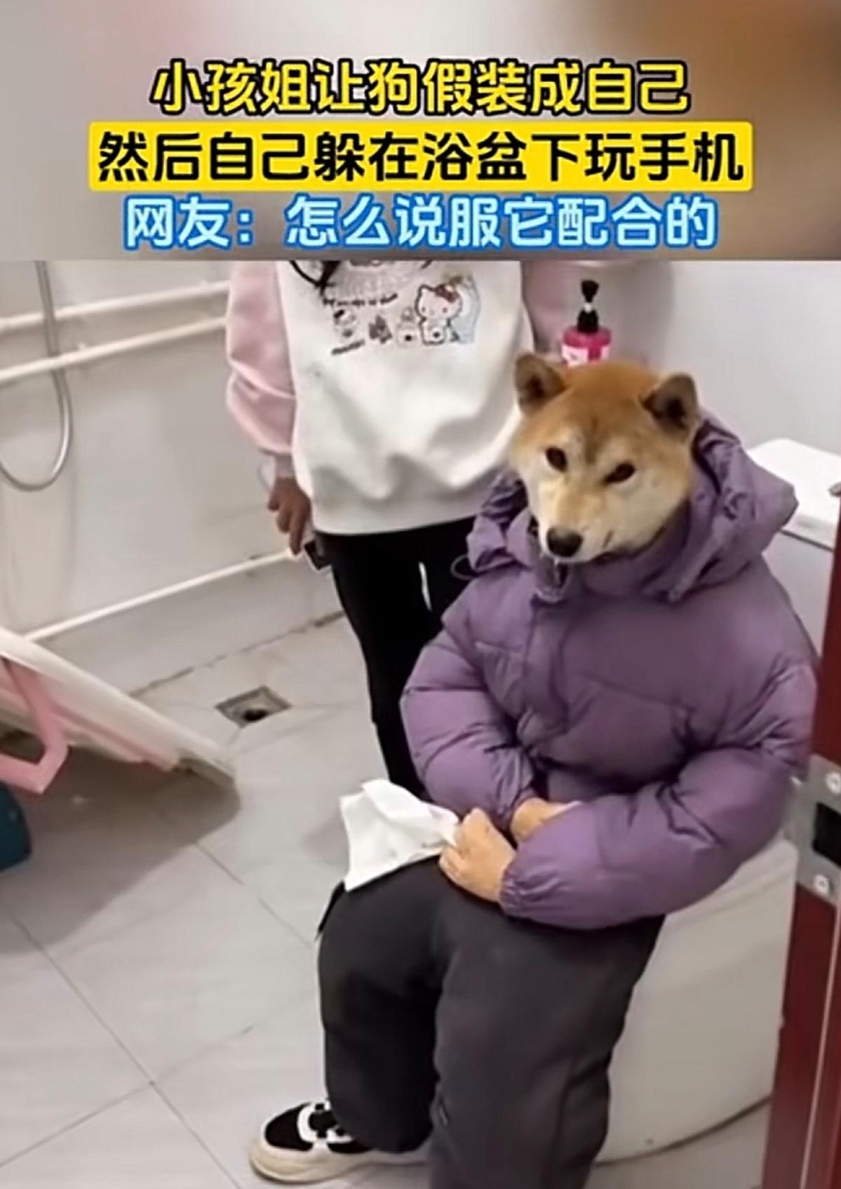 还真挺像的,一开始我以为坐在马桶上的是一个小孩子。没想到居然是他们家的二哈(狗狗)。这个小女孩还真是聪明,自己则躲在浴盆下玩手机。问题是,这条二哈,是怎么做到这么乖巧的?居然能够配合小女孩做这事。还做的有模有样的。这个坐姿,外加穿上的衣服和鞋子,真的很像小孩子![捂脸][捂脸]