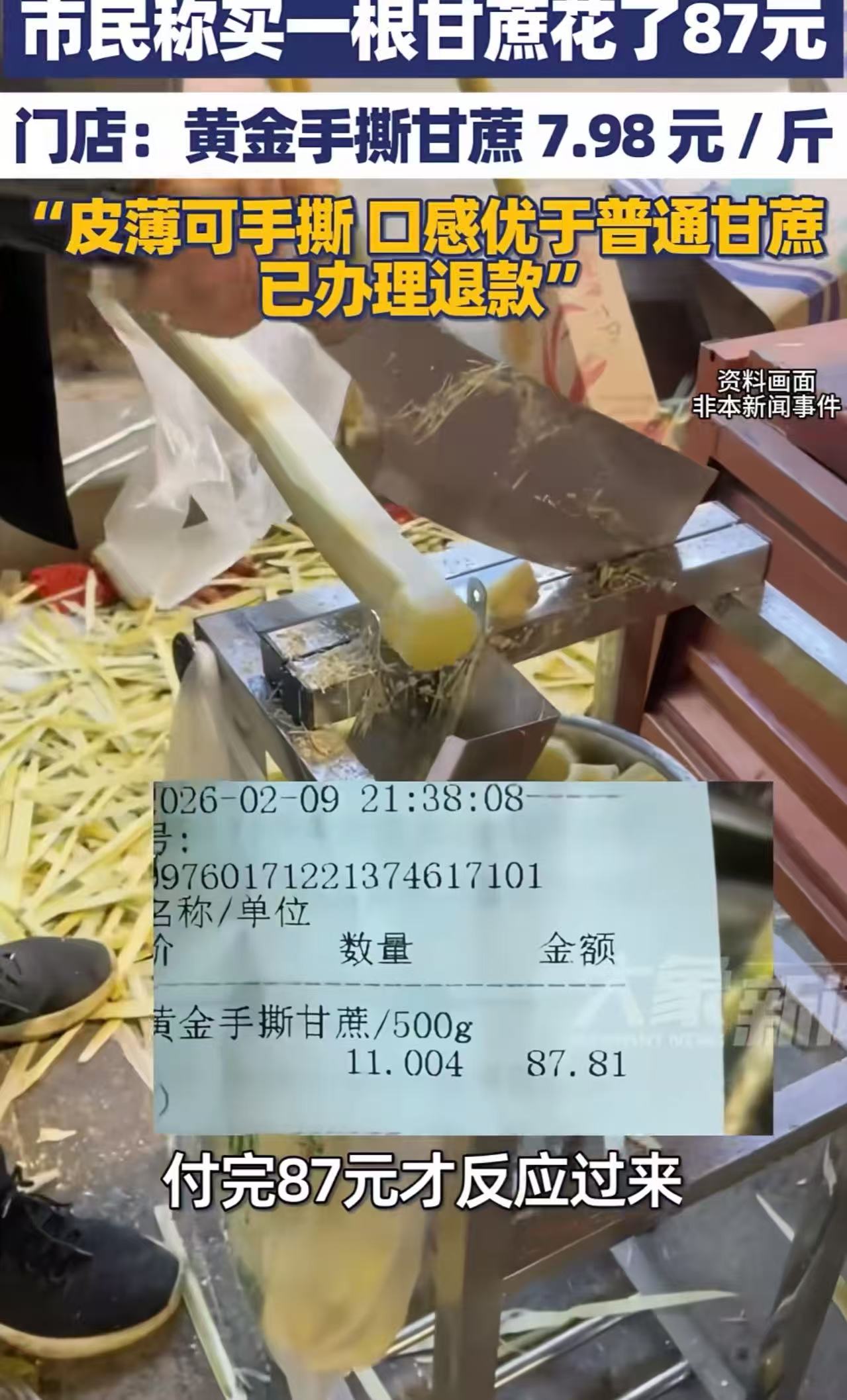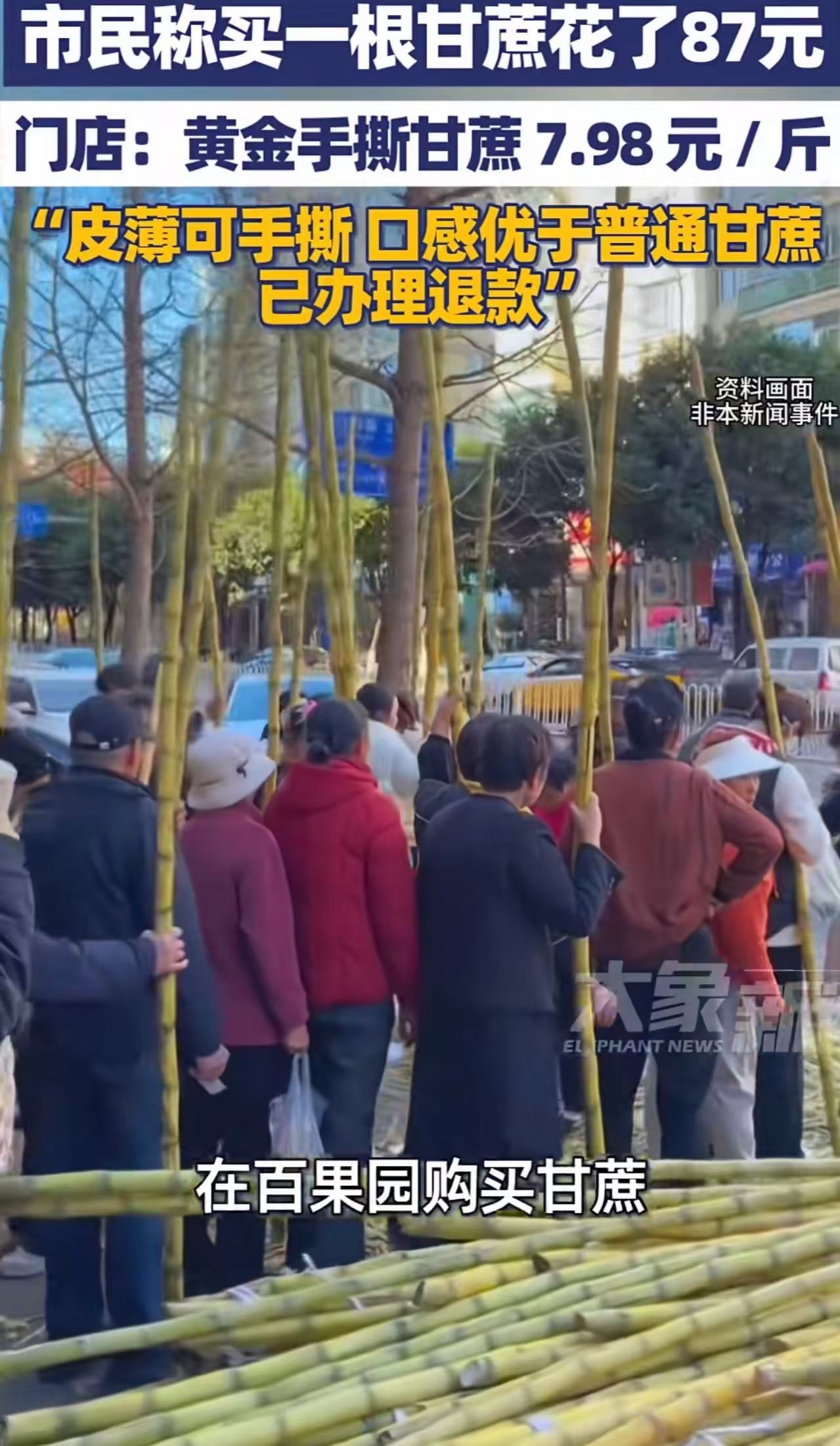面对舆论,涉事门店迅速回应:“顾客选购时,店员已明确告知这不是普通甘蔗,并现场手撕果肉给他试看。他当时没异议,结完账才觉得贵。出于体验考虑,我们已全额退款。”