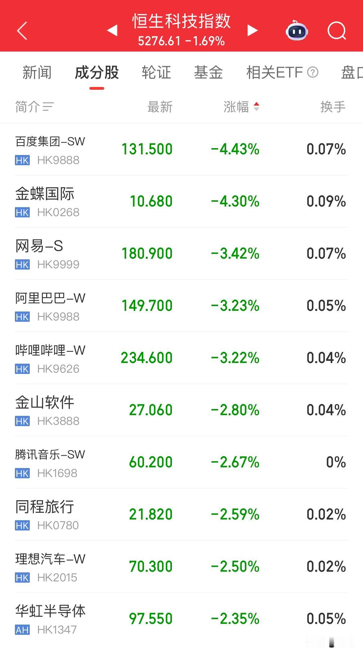 港股今天开市跌近1%,恒生科技指数现跌1.9%,科技股再次遭遇新春集体下跌,其中百度跌4.43%、阿里巴巴跌3.23%、网易跌3.42%、哔哩哔哩跌3.22%、腾讯跌0.66%。