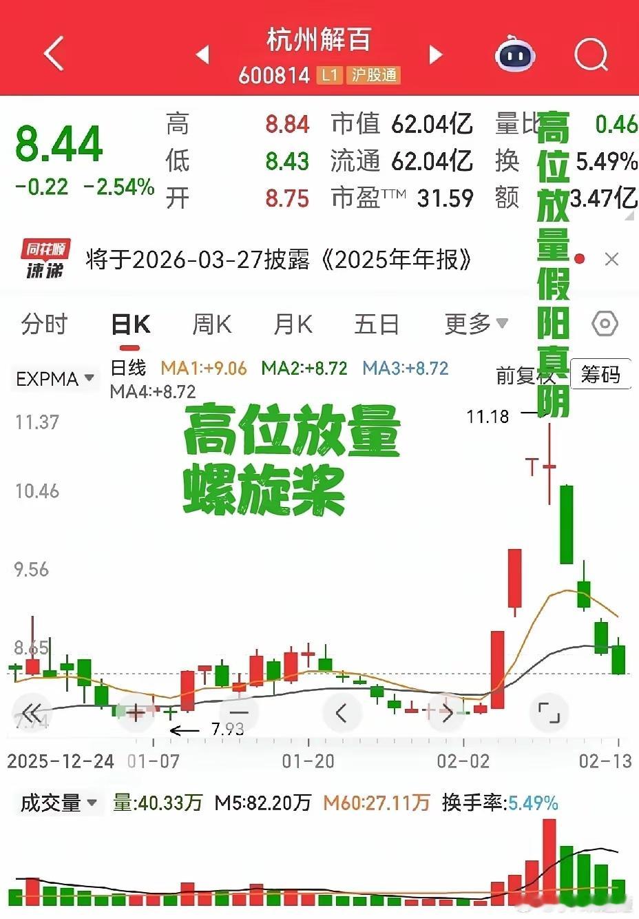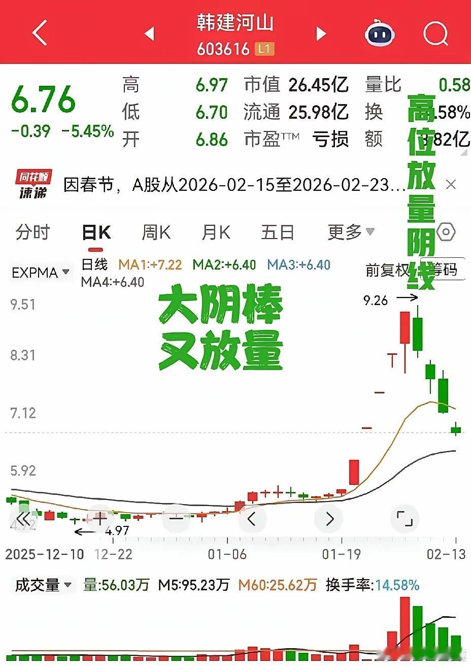 经典形态既有上涨也有下跌,大家都喜欢上涨的,忽视下跌的,然而就是这样下跌的才是非常重要的,在股市里混,如果能避免做到此类即将大跌的形态,先让自己立于不败之地,就已经成功一半了。韩建河山,五个涨停板后,放巨量收阴线,此时不跑,吃亏的概率大增。这种情况,应该是跑错也要跑。名雕股份,涨幅较大之后,出现放量大阴线,先跑为上,主力意图比较明显。杭州解百,三连板后,放量螺旋桨,而且是个假阳真阴,主力做诱多阳线,不跑吃亏大了。特别提醒:贴图欣赏,并非推荐,据此操作,风险自担。