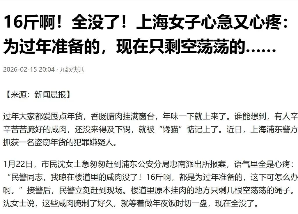 上海,女子腌制了16斤的咸肉,晾在楼道里,就等待年夜饭时,一家人品尝着有年味的咸腊肉,不料这些咸肉不翼而飞了,她赶紧报了警,结果捉到一个让人不可思议的小偷。 沈女士推开楼道门时,第一眼看的不是脚下,也不是楼梯口,而是头顶那根平时用来挂年货的绳子。 她心里原本还抱着一点侥幸:也许是风把东西吹歪了,或者家里人挪了位置忘记告诉她,可那根绳子在穿堂风里轻轻晃着,下面空空荡荡,什么都没有,她一下就明白了——不是掉了,是没了。 那天是1月22日,离春节很近了,上海人做咸肉讲究时令,腌制、晾晒、收成,每一步都靠天气和耐心。 肉要提前选好,肥瘦合适,抹盐要均匀,腌的天数要够,挂出来后,还得让冬天的冷风和阳光慢慢把味道“做出来”。 沈女士那16斤咸肉不是随手买的现成货,是她一段时间的准备,也是她家年夜饭桌上要用的东西:有的切片蒸,有的跟菜饭一起煮,剩下的还能留到元宵以后慢慢吃。 对她来说,那不是“几块肉”,是过年的一部分,她其实也不是完全没防备。 楼道里有流浪猫,她怕猫闻到肉味会跳上来啃,所以特意把咸肉挂得很高,按她的经验,猫最多在下面转两圈,够不到也就算了,她防住了猫,却没想到真正伸手的不是动物,是人。 更让她火大的不是少了一两块,而是“扫走”了,16斤,一块没剩,那种感觉很强烈:不像有人顺手拿走一条解馋,更像是有人盯上了你挂在外面的东西,直接整批打包带走。 你不只是心疼钱,心里那种被侵犯的感觉会冒出来——这是你家年货,别人凭什么当成公共资源拿走? 沈女士气得不行,当天就去了派出所报案,她说得很清楚:东西挂在楼道里,位置在哪、什么时候挂上去的、什么时候发现没了、大概多少斤、估算价值。 民警先按程序做笔录,再去了解楼道情况和监控覆盖,楼道是不是有摄像头、门口有没有出入口记录、嫌疑人可能从哪个方向走,能不能锁定时间段,这些都得一项项核实。 警方后续处理速度不慢,监控里人脸和动作如果清楚,查起来就会比较快,最终锁定了嫌疑人徐某,2月9日,民警上门将人带回进一步调查。 徐某在询问时,给的理由很简单,甚至有点荒唐:他说自己“爱吃肉”,他路过楼道,抬头看到咸肉挂着,觉得诱人,就动了心思。 听起来像一句轻飘飘的借口,但也恰恰说明了问题:并不是他饿得走投无路,而是看到“别人家的东西”就忍不住伸手。 这种行为,在有前科的人身上并不少见——偷不是因为缺,而是因为习惯,顺手牵羊久了,就把别人的财物,当成可以下手的目标。 很多人会觉得,这种咸肉按市场价算,可能也就两三百块,金额不大,最多是治安案件,可法律在这里看得不只是一笔“值多少钱的肉”。 如果徐某属于多次盗窃的情形,即便单次案值不高,也可能直接触及刑法意义上的盗窃罪,这也是很多惯偷容易误判的地方:他以为“小额”就没事,但“次数”会把性质拉上去。 目前警方对徐某采取了刑事强制措施,对徐某来说,这口“年货”没吃踏实,反而把自己送进了更严厉的程序里;对沈女士来说,咸肉不一定能完完整整追回来,但至少事情有了结果,有人要为这次行为付代价,她心里那口气才能落一点。 这件事也提醒了住在城市小区的人:楼道虽然看起来像“邻里空间”,但从安全意义上说,它是公共区域。 你觉得熟人社会还在,觉得大家都讲规矩,但现实是楼里进进出出的人很多,外来人员也可能混在其中,一旦诱惑摆在眼前,总有人会动歪心思。 把年货挂在楼道里,确实有风险,尤其是贵重、容易带走、又很显眼的东西。 以后晒腊肉、咸肉,最好还是在自家阳台、窗外可控的地方,或者加装防护网、挂锁,至少让“伸手”的成本变高。 年味当然在吃,也在准备,但更重要的是过年的踏实感——别让一时图方便,把自家年夜饭的菜,变成别人顺手的“战利品”。