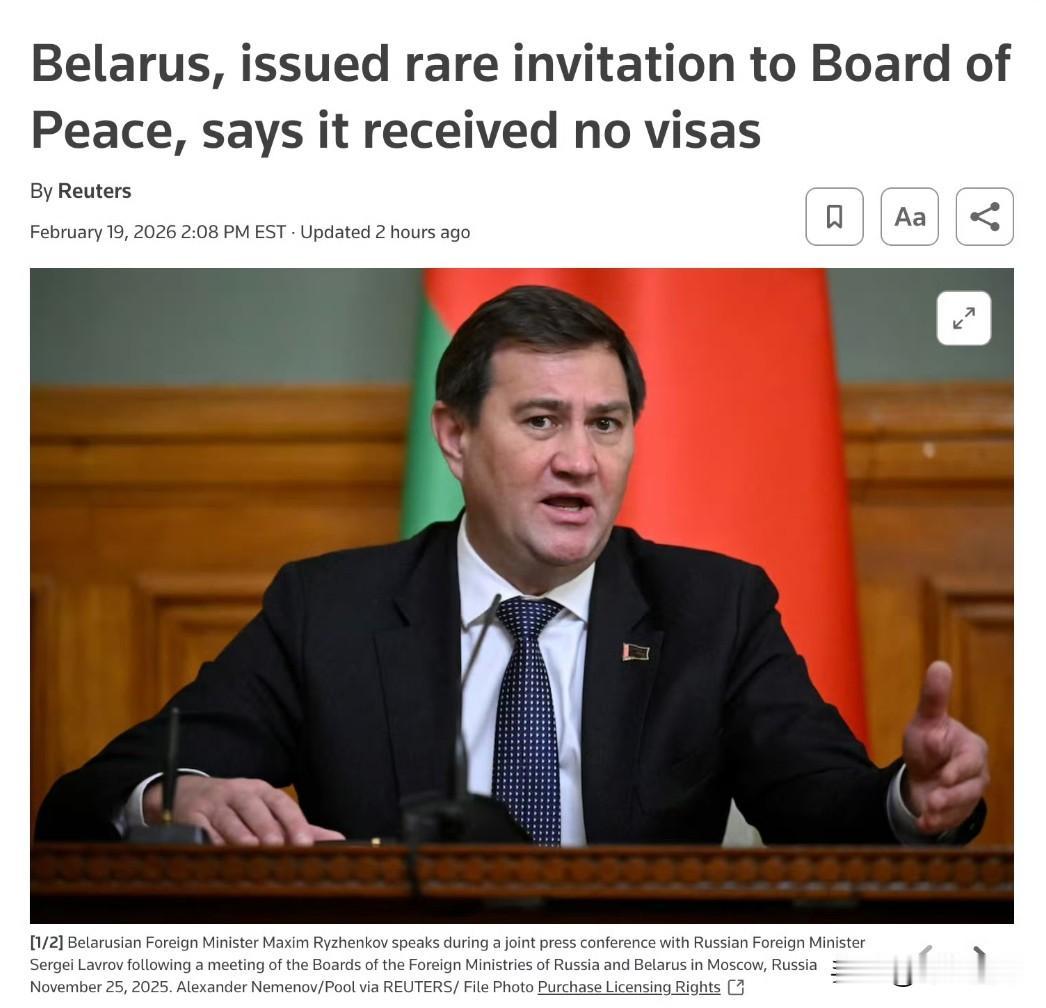 白俄罗斯称他们已经准备好去参加特朗普的会议了,但是美国没给他们发签证。 作为俄罗斯的盟友,白俄罗斯很少受邀参加国际会议。该国周四表示,原本打算参加美国总统唐纳德·特朗普在华盛顿举行的和平委员会首次会议,但未能获得必要的签证。 白俄罗斯外交部表示,白俄罗斯外交部长马克西姆·雷任科夫原本应该出席,美方已正式通知了他。“然而,尽管我们这边已经完成了所有必要的程序,但我们的代表团仍然没有获得签证。”