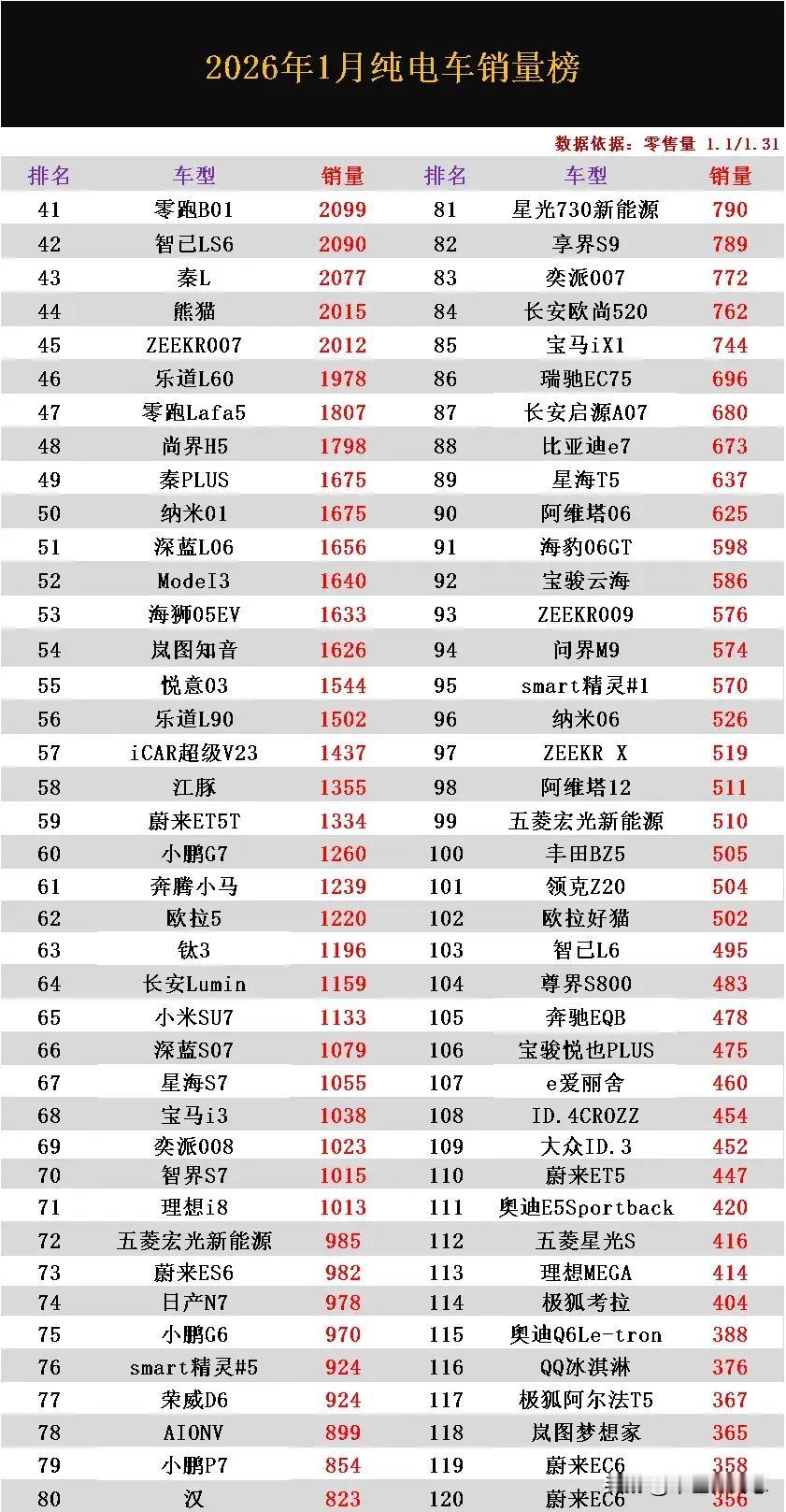 太惨了!进入2026年以后纯电车市场整体销量出现暴跌,仅剩7款月销量破万辆,曾经的销量主力海鸥、元UP等车型排名都罕见跌出榜单前十,市场排名又开始大洗牌了。快来看看你的爱车排在第几名?有没有下跌?