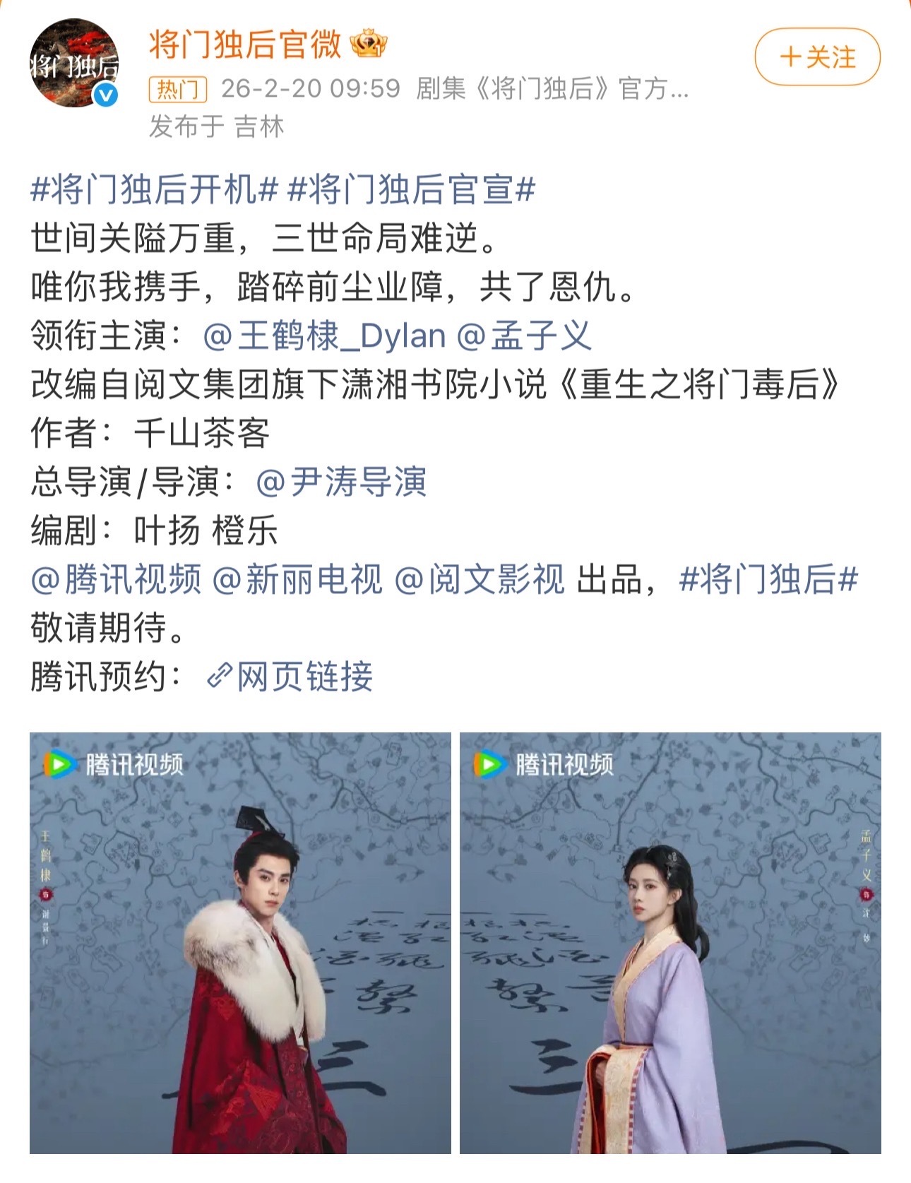 将门毒后将门独后官宣:王鹤棣、孟子义