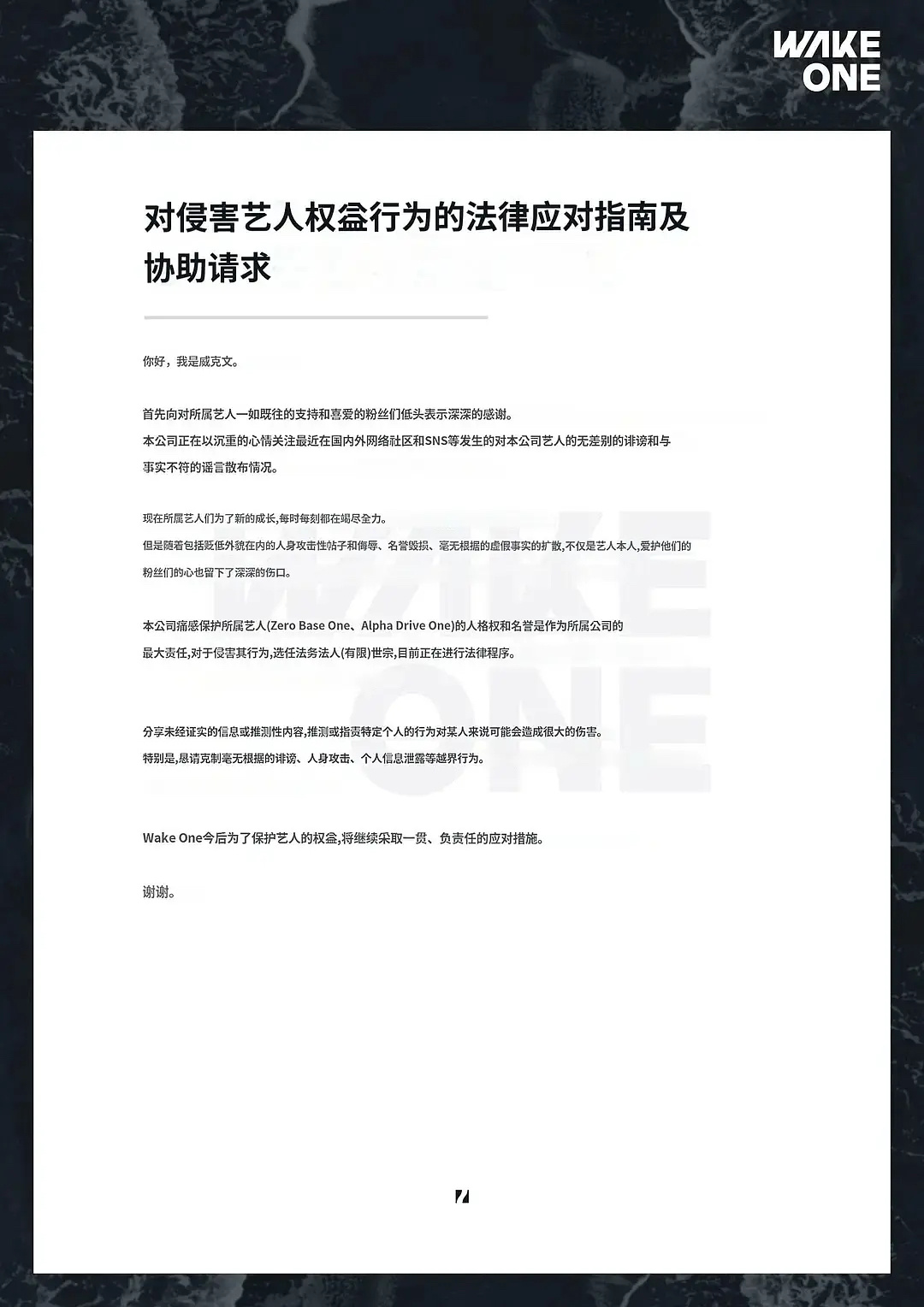 WK1发公告对于最近艺人遭受的诽谤和事实不符的谣言,目前正在进行法律程序应对。