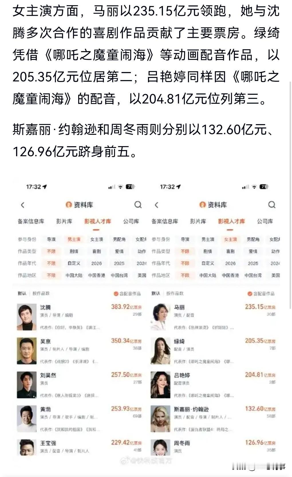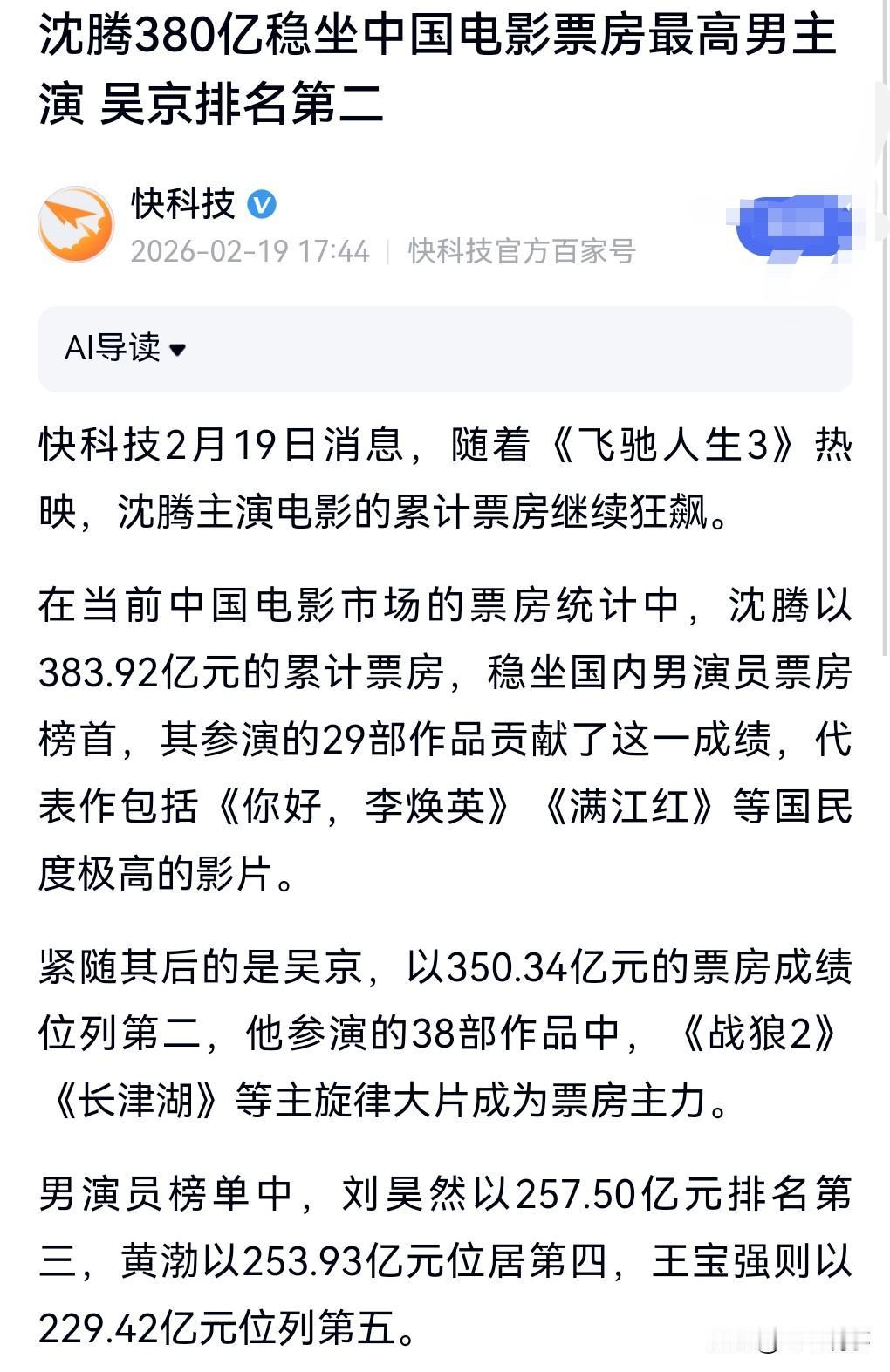 厉害了啊。沈腾稳坐中国电影票房最高男主演,主演电影票房将近400亿。 沈腾的票房号召力还是很好的,如果遇上一个好的团队,那更是如虎添翼了。 这票房高不高取决于出演的电影热不热门,受不受大众的喜欢。 第2位的是吴京。 女演员排名第一的是马丽。