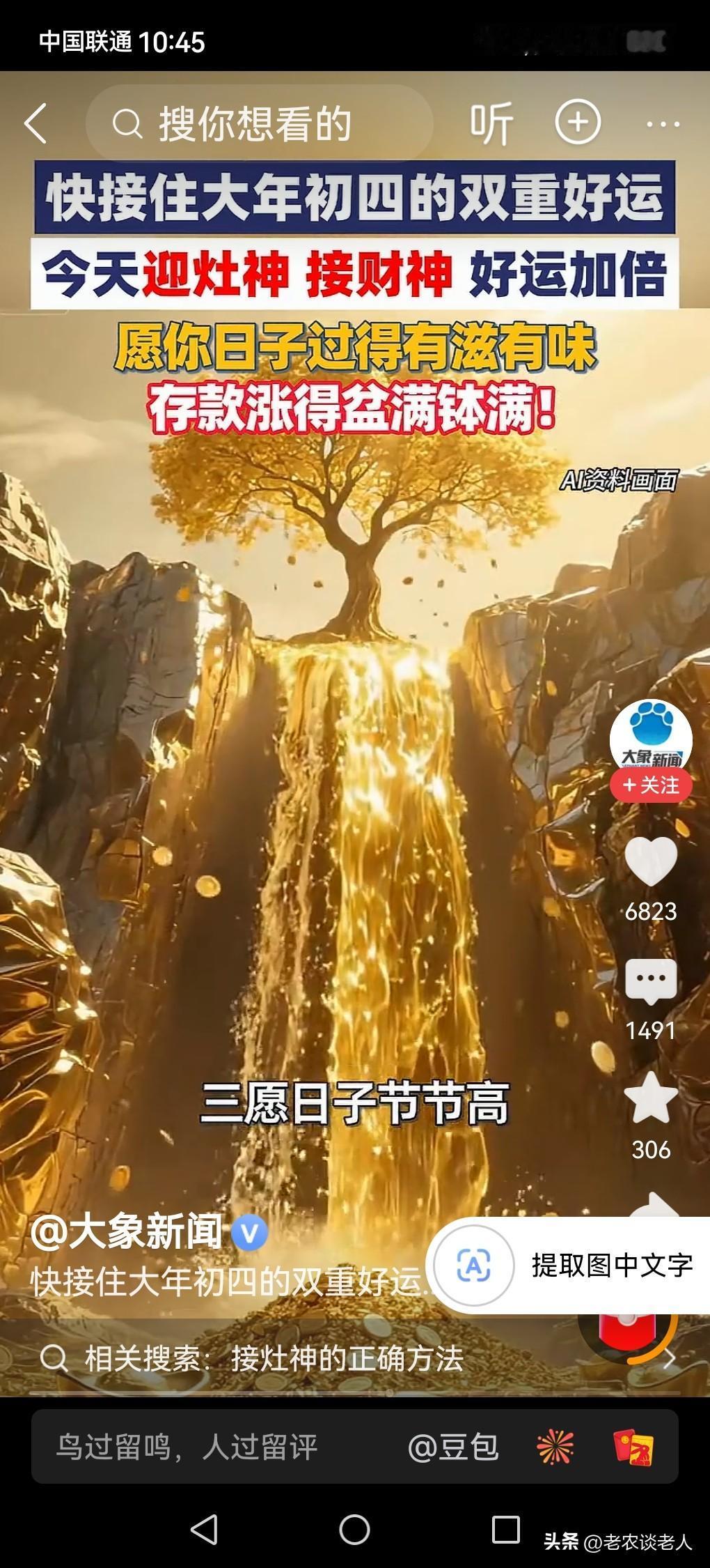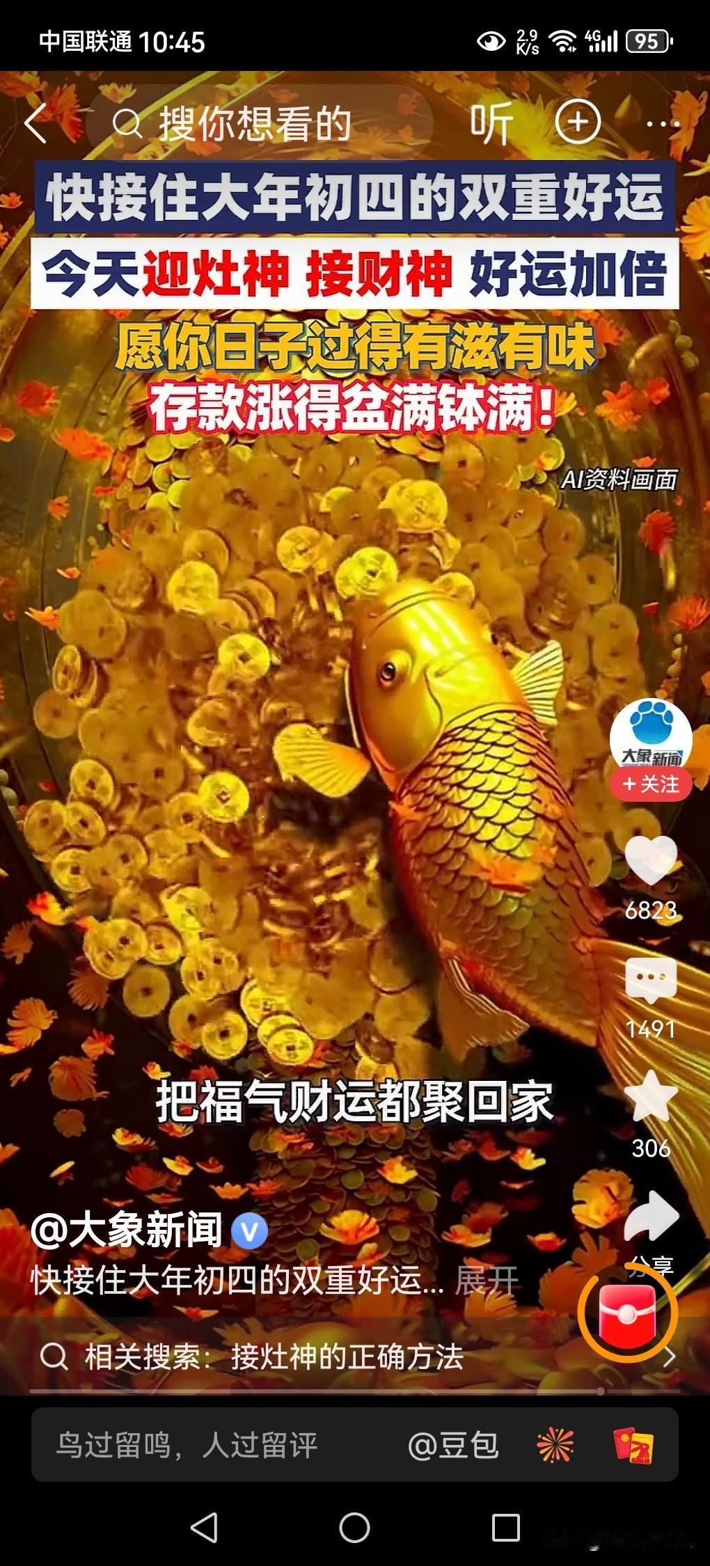 大年初四接灶神、迎财神,好运加倍! 本人在小童年的时候,就听家里的人说,大年初四要接灶神,迎财神,是必须要做的事情,做好了这两件事,一年中一家人的好运将会加倍,好运连连,就会万事如意,财源滚滚。 有人说这是封建迷信,本人认为,这并非如此,并非有些人所想象的那样,而是古人的智慧,是现在人传承春节传统文化习俗。 所以说接灶神,迎财神,是人们为了追求美好的幸福生活,对美好幸福生活的向往,是一年的最美好的预兆。 俗话说,“心诚则灵”,人们对美好的幸福生活有憧憬,有向往,有追求,就一定会实现。所以,古人认为春节正月初四接财神,迎财神都是为了美好的幸福生活,追求幸福的一种心理表现,对实现幸福生活非常自信,必然会实现自己的心里的愿望。 最后,祝愿大家办好接财神,营造神,恭喜发财,好运连连。