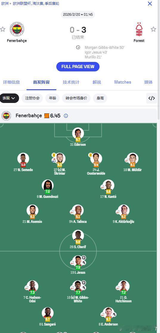 换帅之后的诺丁汉森林,客场3-0战胜费内巴切