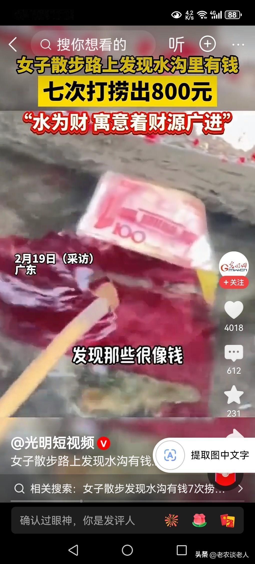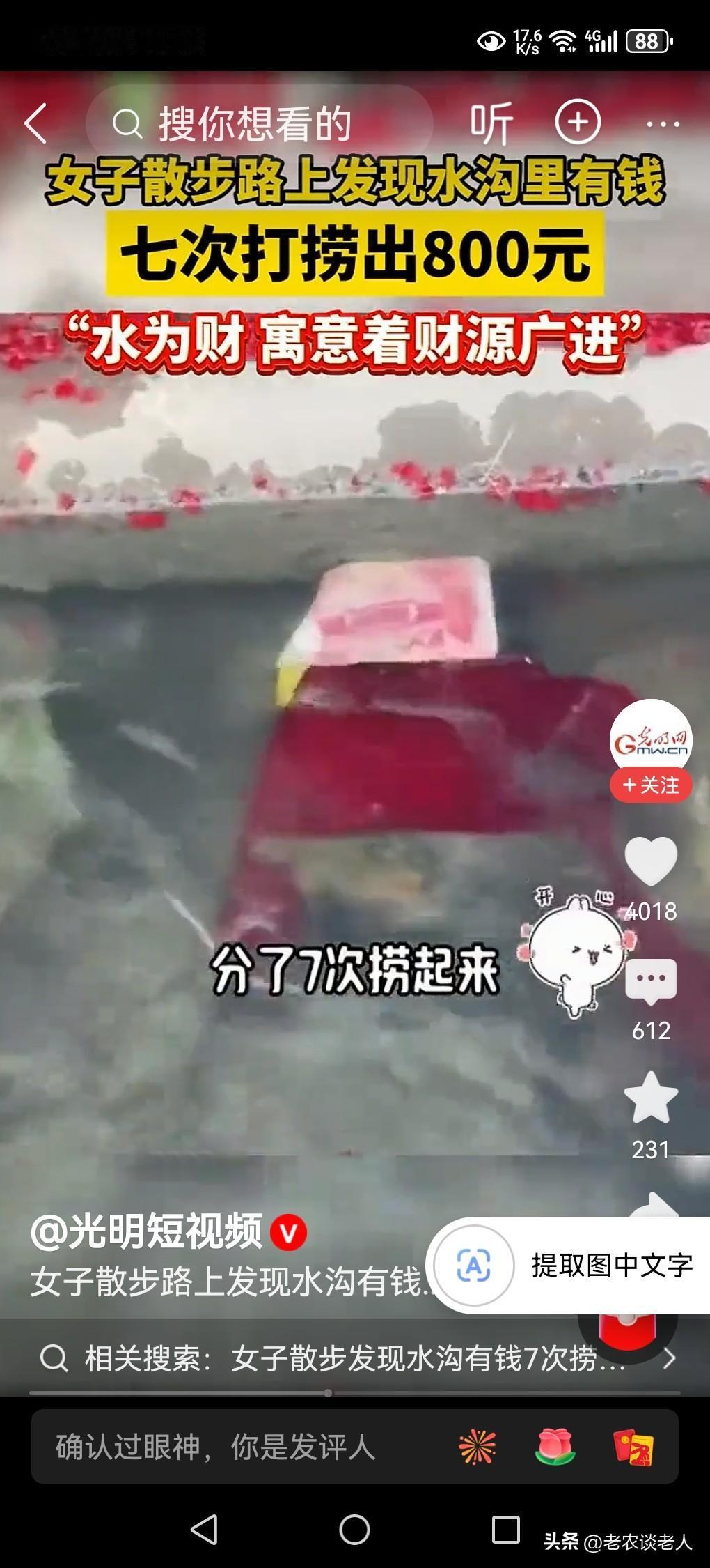 女子散步发现水沟有钱 7次捞出800元! 本人今天早晨路过家门前的一条小溪时,发现小溪的水垱里有一个红包,红包口上有红色的百元大钞显露出来。我惊喜的从剌骨寒冷的溪水里拿起来一看,内面装有1000元钱。 这个寓意非常好,1000元钱整10张百元大钞真是“十全十美”。据风水学说,水就是财,有水就有财,水里来财,就是水到渠成的事情。这意外来财确实让人惊喜,大年初四就捡到了一个非常好的兆头。 无独有偶,据媒体2月20日报道,广州一女子在散步的路上,发现水沟有钱,7次捞出800元!真是意外之财! 问题来了,这种意外之财,是不是要归还失主?去寻找失主?过大年,按照古老的传统文化习俗,捡到的钱,是不能还给人家的!若是不归还,是不是涉嫌违法?是不是违背道德? 你怎么看?请在留言区里留下你宝贵的意见,并积极参与评论。 问界M9祝您新年手到福来女子散步发现水沟有钱 7次捞出800元