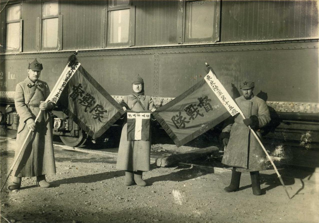 1929年,三名前苏联士兵正在展示缴获的东北军督战队旗帜。这一年,中苏之间围绕中东铁路控制权爆发的武装冲突,史称“中东铁路事件”。 1929年5月,东北方面强行收回中东铁路管辖权,并驱逐苏方管理人员。8月,苏军发动进攻,东北军仓促应战,双方在满洲里和绥芬河等地发生激战,最终东北军惨败。 12月22日,中方被迫签署《伯力协定》,恢复中东铁路的共管原状。1935年,苏联将铁路出售给日本控制的伪满洲国。直到新中国成立后,铁路主权才被彻底收回,真正回到人民手中。