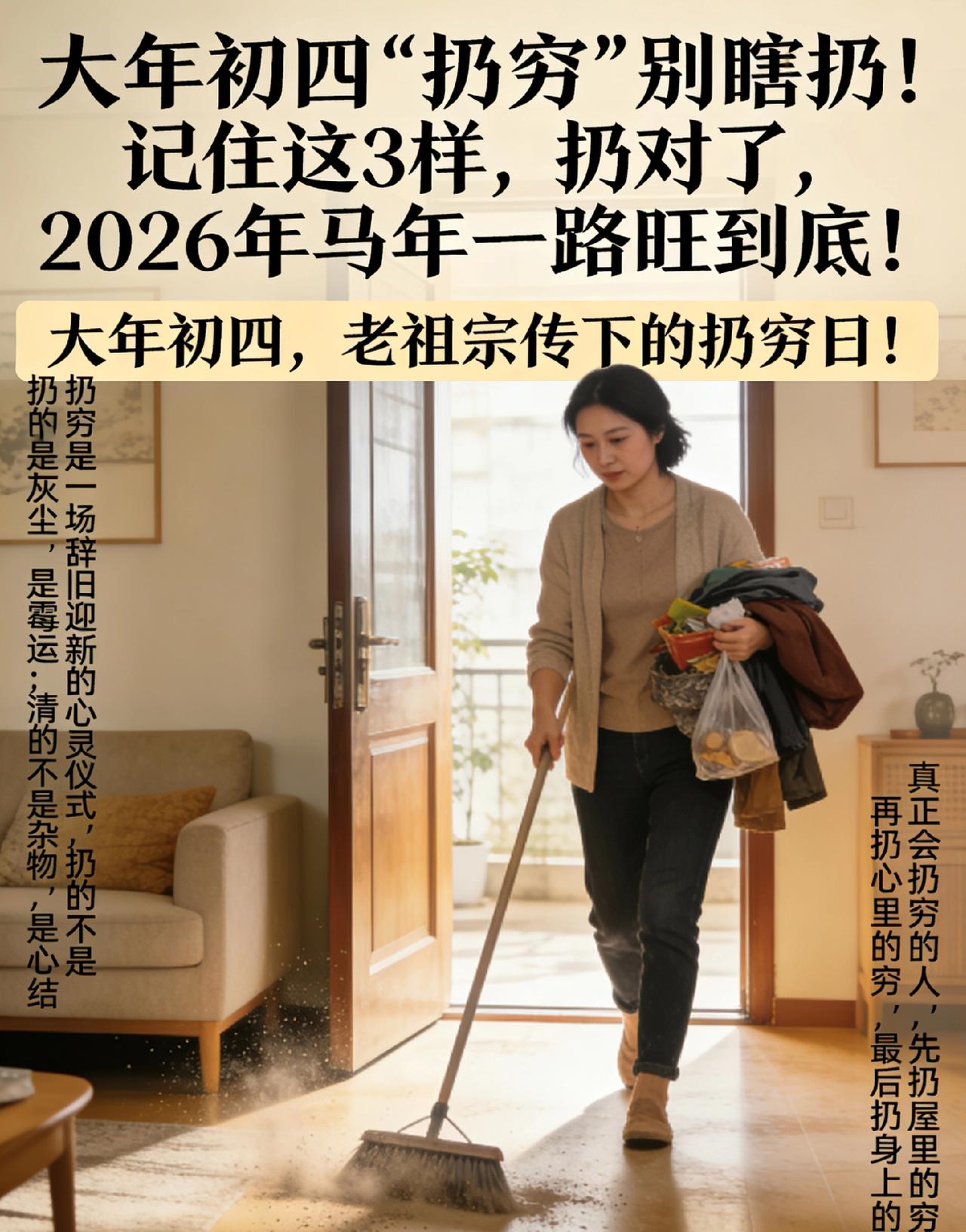 大年初四“扔穷”别瞎扔!记住这3样,扔对了,马年一路旺到底! 大年初四,老祖宗传下的扔穷日! 很多人随手拎一袋垃圾下楼,就当完成任务,殊不知,扔穷从来不是扫卫生,而是一场辞旧迎新的心灵仪式。它扔的不是灰尘,是霉运;清的不是杂物,是心结。这不是迷信,是中国人最懂的生活底气,是给新年最好的开场。 真正会扔穷的人,都懂这3件事。 先扔屋里的穷。从屋子最深处往门口扫,不放过任何角落,把积攒几天的垃圾、破损的旧物、不用的杂物一次性清走。屋子乱,心气就乱;杂物多,福气就进不来。干干净净的家,才装得下红红火火的日子。 再扔心里的穷。这才是重中之重!扔掉去年的焦虑、委屈、内耗和自我怀疑,扔掉深夜的失眠、无人懂的疲惫、放不下的遗憾。别让坏情绪跟着过年,别让烂心事绊住新年。心宽一寸,路宽一丈;心无阴霾,满眼皆是春光。 最后扔身上的穷。扔掉拖延、懒惰、摆烂,扔掉得过且过的敷衍。新的一年,要精神饱满,要脚踏实地,要敢闯敢拼。人勤地不懒,心正福自来,好状态,才是最好的风水。 扔穷,是告别,更是迎接。 把穷气、晦气、怨气统统关在门外,把财气、福气、喜气通通迎进家门。老祖宗的习俗,藏着最朴素的智慧:轻装上阵,才能走得更远;清空过往,才能拥抱新生。 今天,你认真“扔穷”了吗?你最想扔掉去年的什么烦恼?评论区留一句穷气全走,福气全来,马年必定顺风顺水,财源滚滚,万事皆胜意